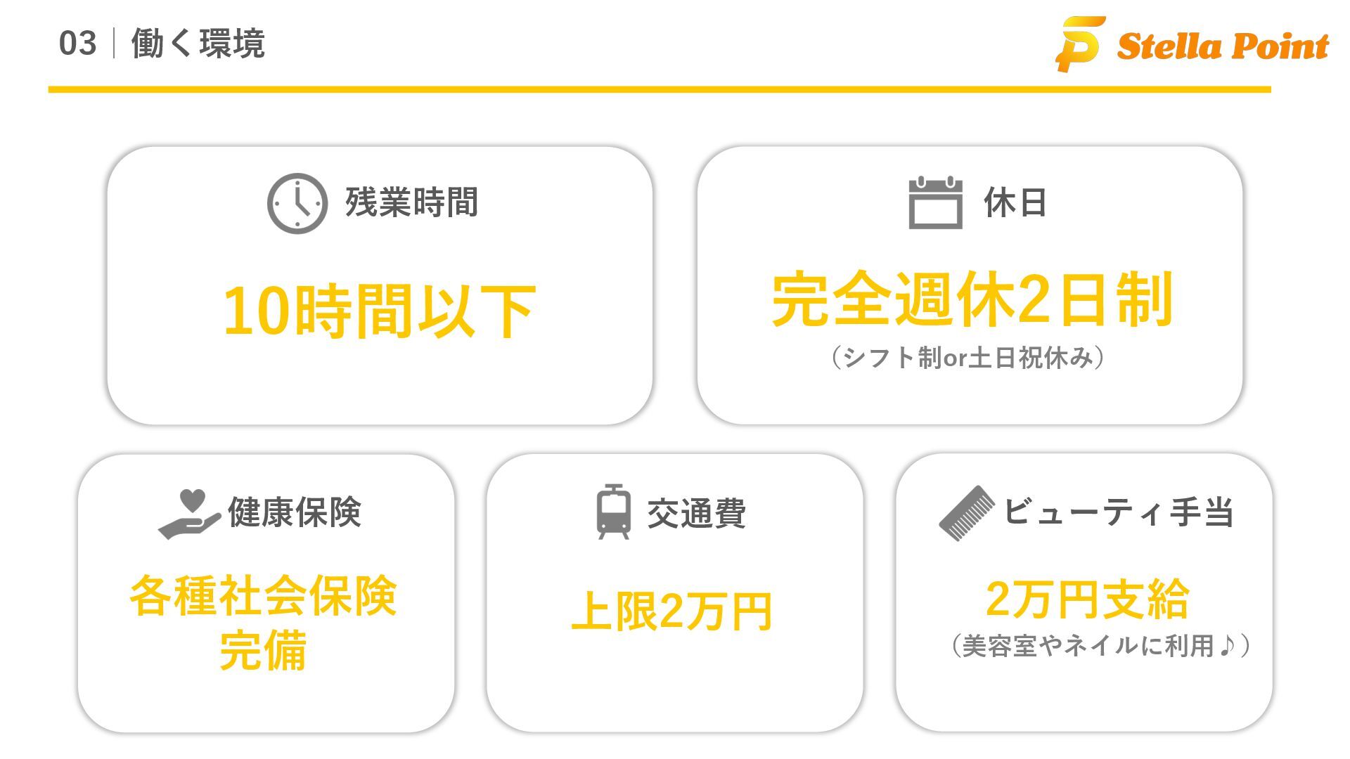 03|働く環境 休⽇ 完全週休2⽇制 10時間以下 残業時間 ビューティ⼿当 2万円⽀給 上限2万円 (シフト制or⼟⽇祝休み) 交通費