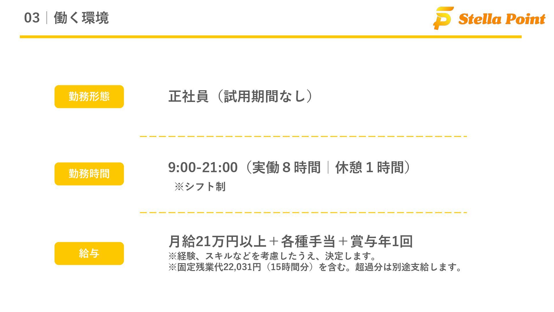 03|働く環境 勤務形態 勤務時間 給与 正社員(試⽤期間なし) 9:00-21:00(実働8時間|休憩1時間) ※シフト制 ⽉給21万円以上+各種⼿当+賞与年1回 ※経験、スキルなどを考慮したうえ、決定します。 ※固定残業代22,031円(15時間分)を含む。超過分は別途⽀給します。