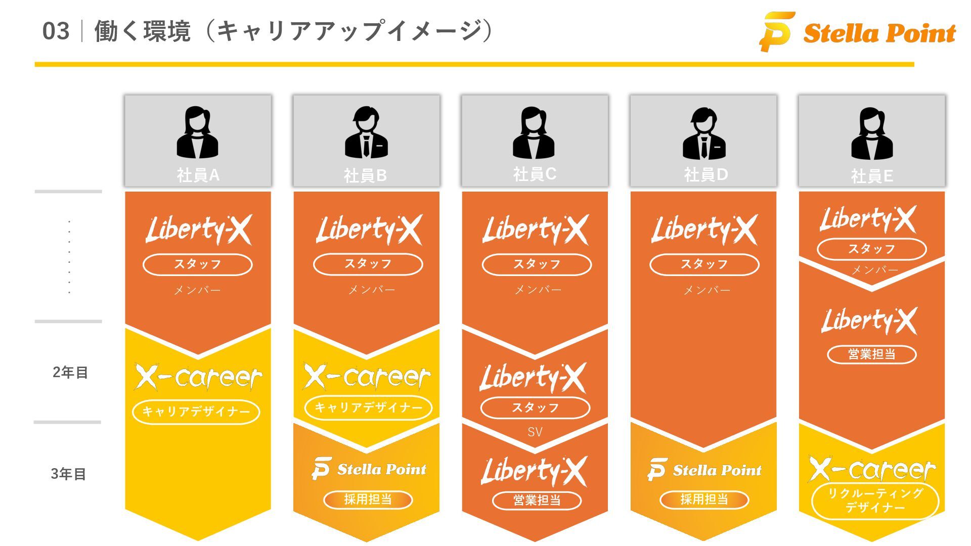 03|働く環境(キャリアアップイメージ) スタッフ スタッフ スタッフ スタッフ スタッフ 営業担当 キャリアデザイナー キャリアデザイナー 営業担当