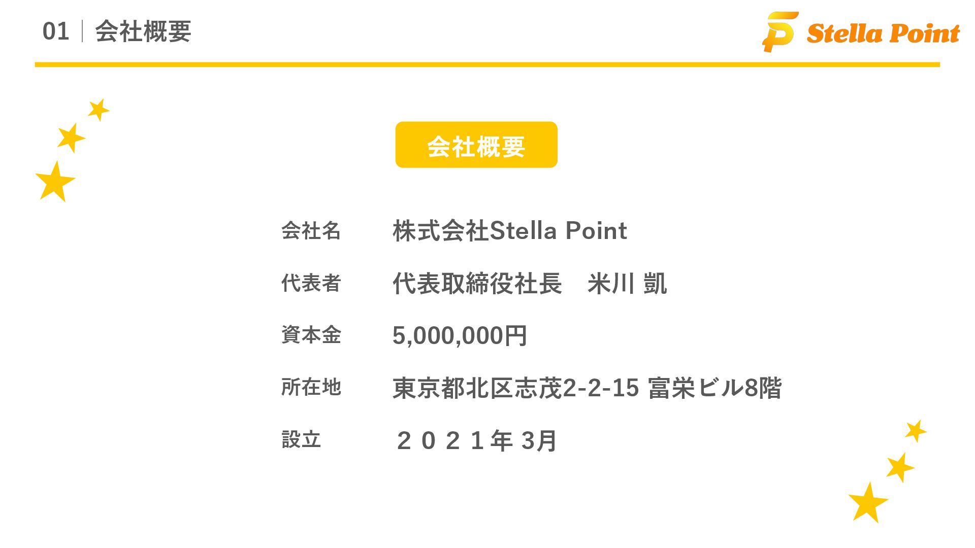 会社名 代表者 資本⾦ 設⽴ 株式会社Stella Point 代表取締役社⻑ ⽶川 凱 5,000,000円