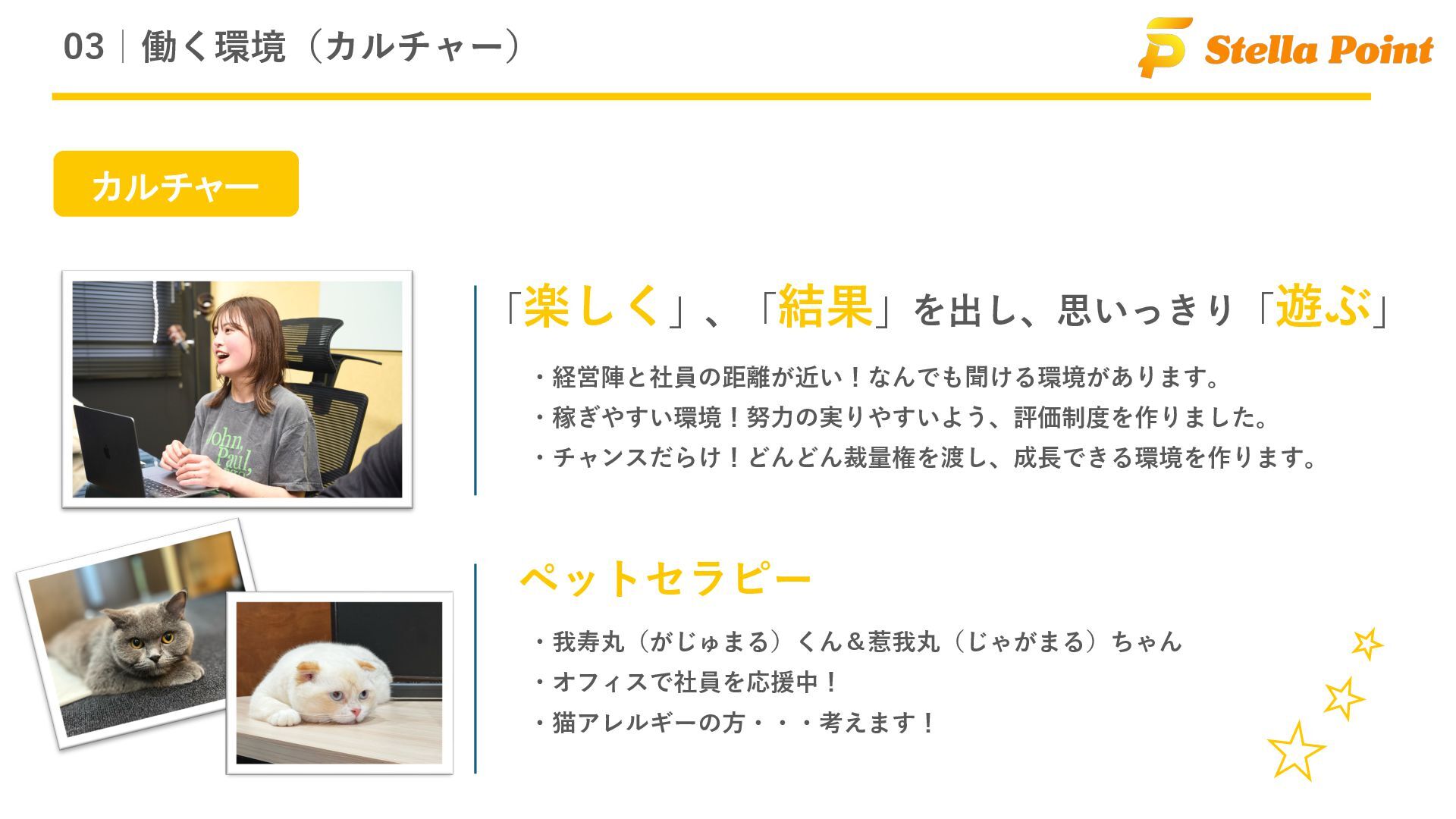 03|働く環境(カルチャー) カルチャー ペットセラピー 「楽しく」、「結果」を出し、思いっきり「遊ぶ」 ・我寿丸(がじゅまる)くん&惹我丸(じゃがまる)ちゃん ・オフィスで社員を応援中! ・猫アレルギーの⽅・・・考えます! ・経営陣と社員の距離が近い!なんでも聞ける環境があります。 ・稼ぎやすい環境!努⼒の実りやすいよう、評価制度を作りました。 ・チャンスだらけ!どんどん裁量権を渡し、成⻑できる環境を作ります。