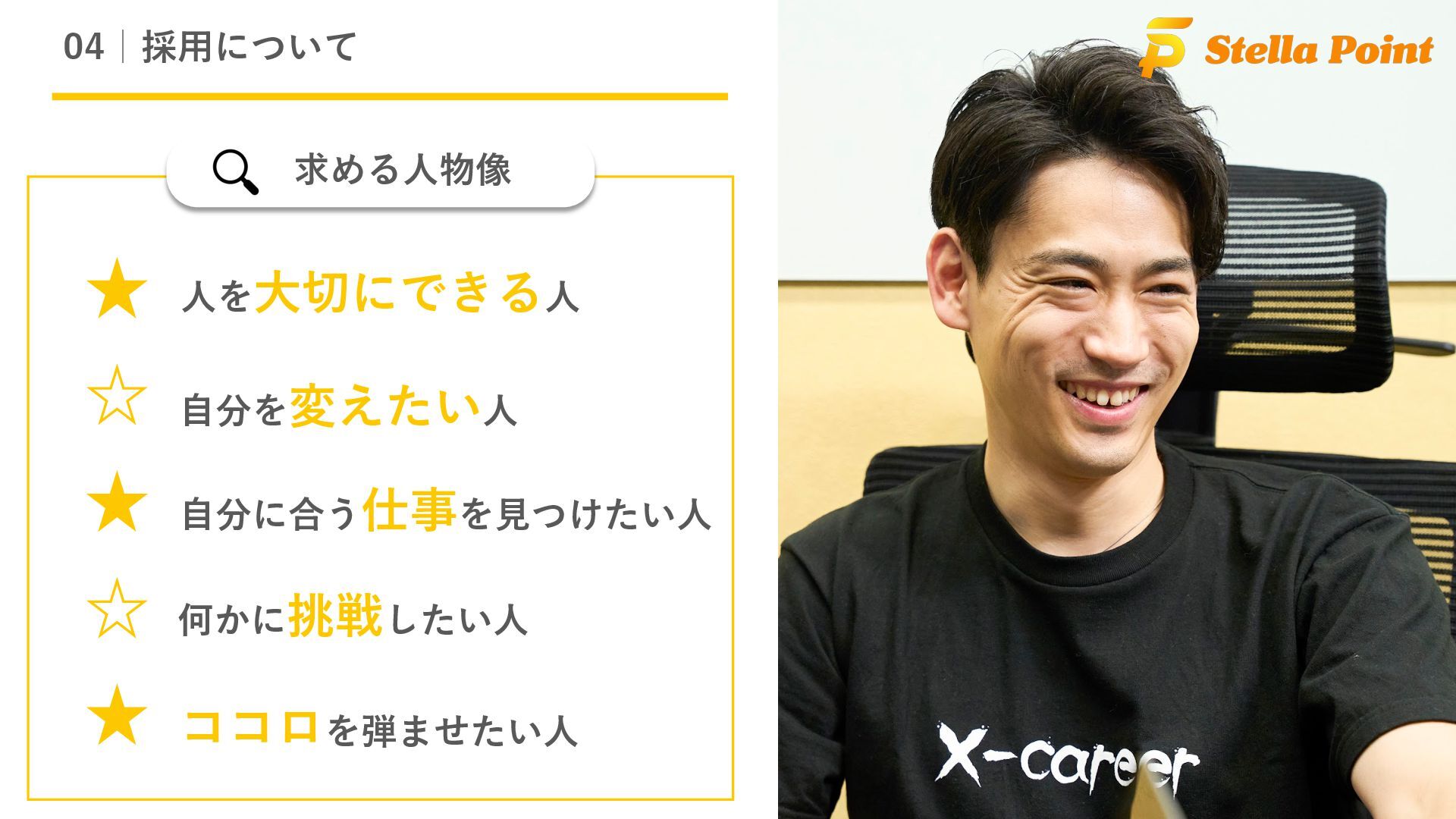 求める⼈物像 04|採⽤について ⼈を⼤切にできる⼈ ⾃分を変えたい⼈ ⾃分に合う仕事を⾒つけたい⼈ 何かに挑戦したい⼈ ココロを弾ませたい⼈
