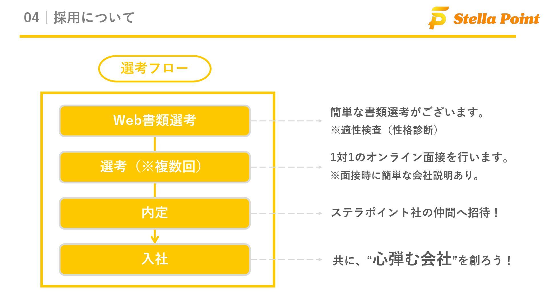 04|採⽤について Web書類選考 選考(※複数回) 内定 ⼊社 選考フロー 1対1のオンライン⾯接を⾏います。 ※⾯接時に簡単な会社説明あり。 ステラポイント社の仲間へ招待! 簡単な書類選考がございます。