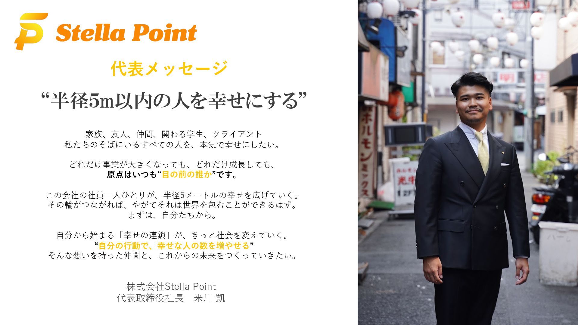 代表メッセージ 株式会社Stella Point 代表取締役社⻑ ⽶川 凱 “半径5m以内の人を幸せにする” 家族、友⼈、仲間、関わる学⽣、クライアント 私たちのそばにいるすべての⼈を、本気で幸せにしたい。 どれだけ事業が⼤きくなっても、どれだけ成⻑しても、