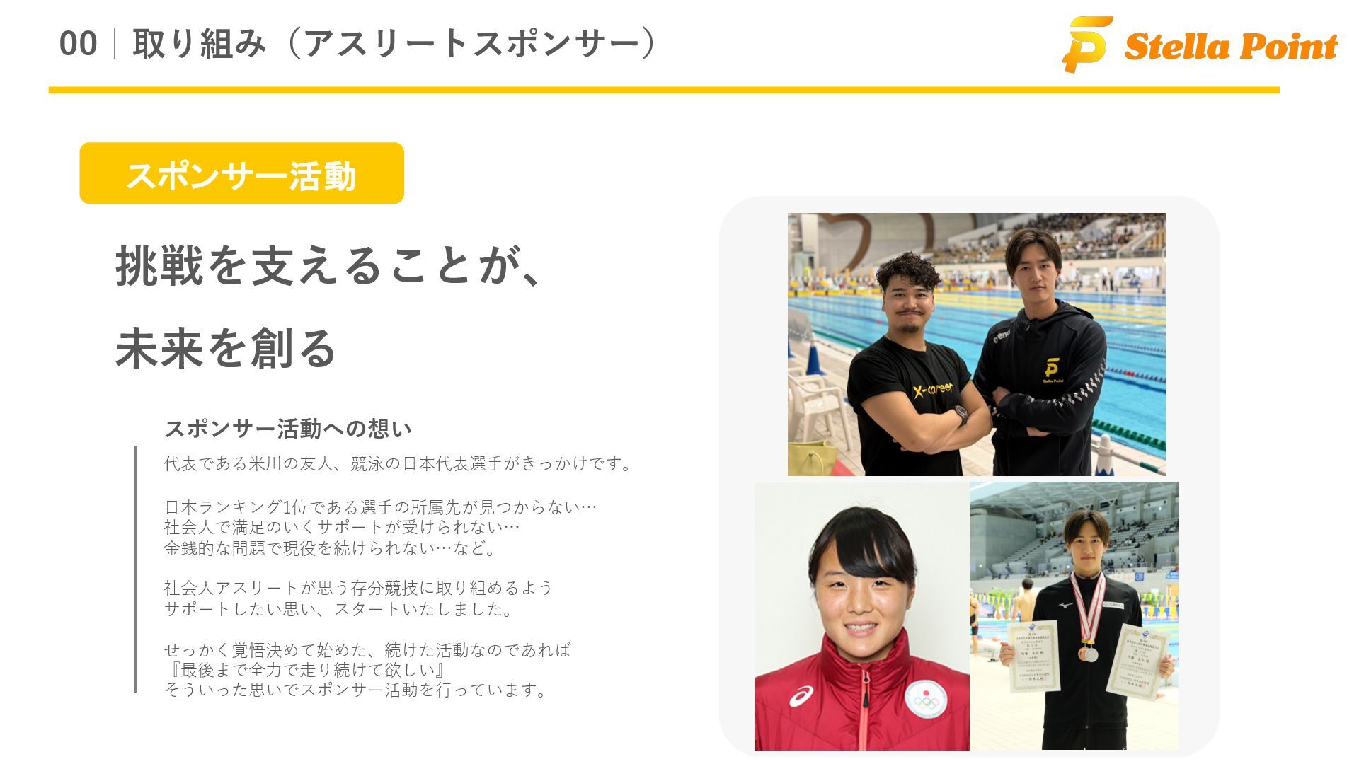00|取り組み(アスリートスポンサー) 挑戦を⽀えることが、 未来を創る スポンサー活動への想い 代表である⽶川の友⼈、競泳の⽇本代表選⼿がきっかけです。 ⽇本ランキング1位である選⼿の所属先が⾒つからない… 社会⼈で満⾜のいくサポートが受けられない… ⾦銭的な問題で現役を続けられない…など。 社会⼈アスリートが思う存分競技に取り組めるよう サポートしたい思い、スタートいたしました。
