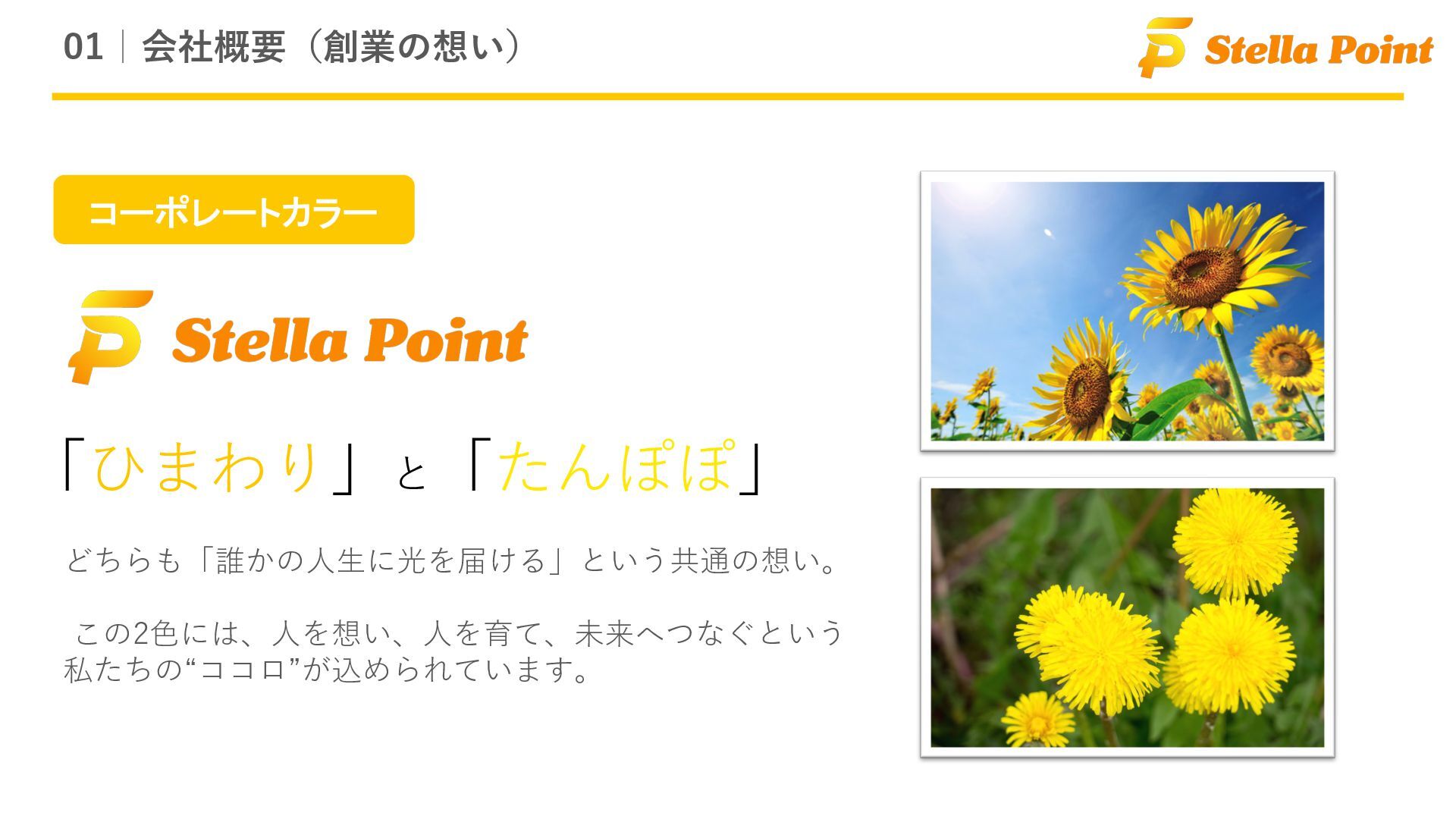 01|会社概要(創業の想い) コーポレートカラー どちらも「誰かの⼈⽣に光を届ける」という共通の想い。 この2⾊には、⼈を想い、⼈を育て、未来へつなぐという 私たちの“ココロ”が込められています。 「ひまわり」と「たんぽぽ」