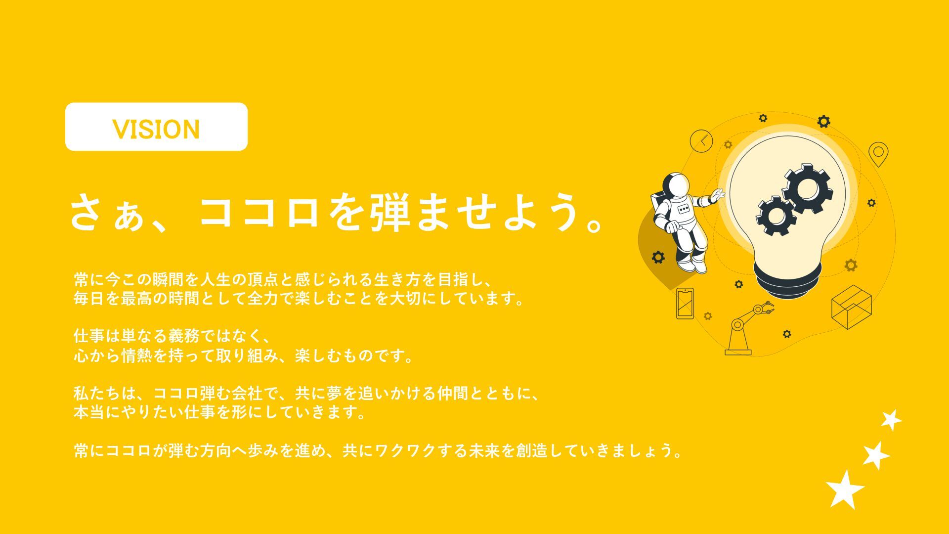VISION さぁ、ココロを弾ませよう。 常に今この瞬間を⼈⽣の頂点と感じられる⽣き⽅を⽬指し、 毎⽇を最⾼の時間として全⼒で楽しむことを⼤切にしています。 仕事は単なる義務ではなく、 ⼼から情熱を持って取り組み、楽しむものです。 私たちは、ココロ弾む会社で、共に夢を追いかける仲間とともに、 本当にやりたい仕事を形にしていきます。 常にココロが弾む⽅向へ歩みを進め、共にワクワクする未来を創造していきましょう。