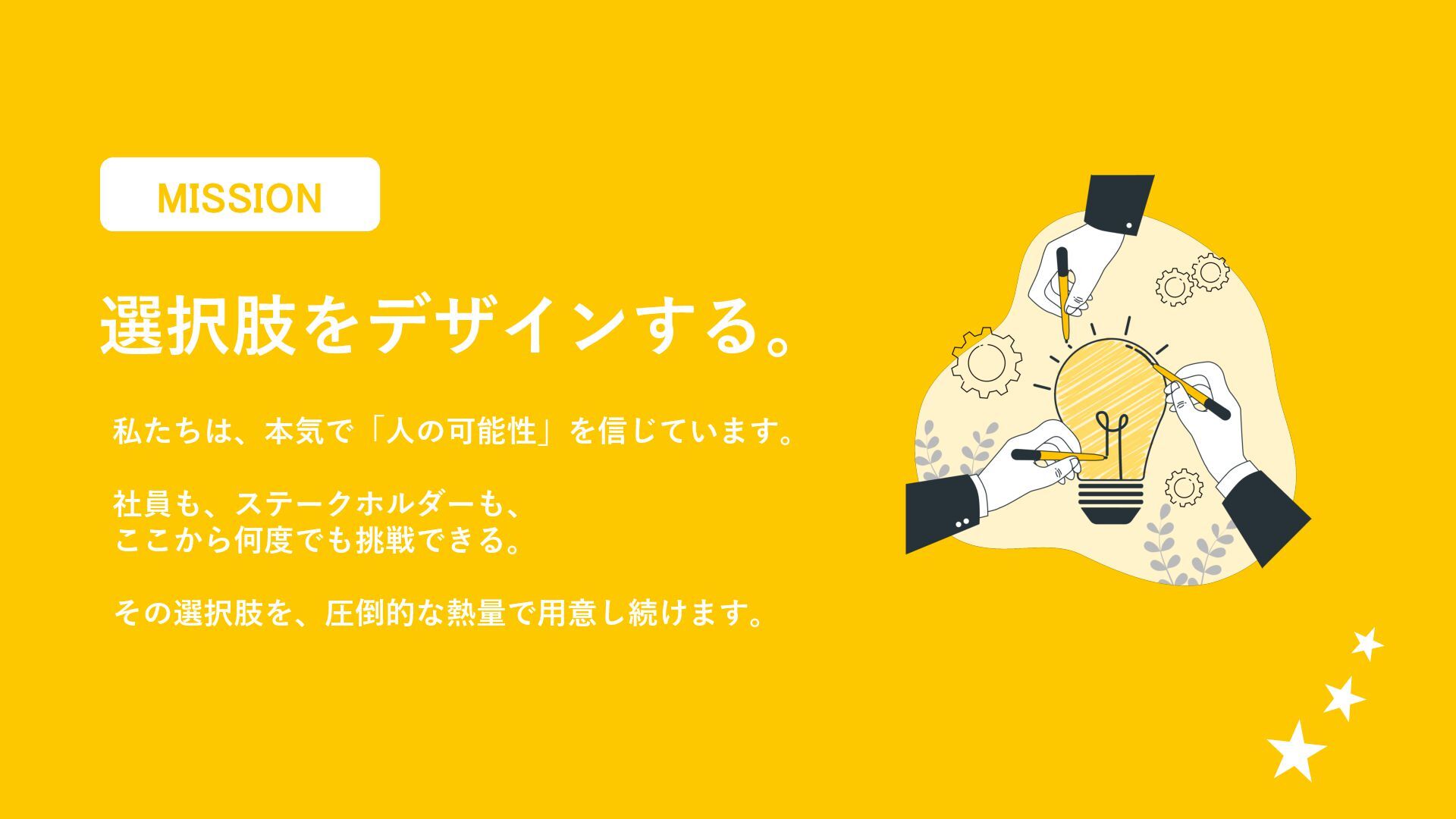 MISSION 選択肢をデザインする。 私たちは、本気で「⼈の可能性」を信じています。 社員も、ステークホルダーも、 ここから何度でも挑戦できる。 その選択肢を、圧倒的な熱量で⽤意し続けます。