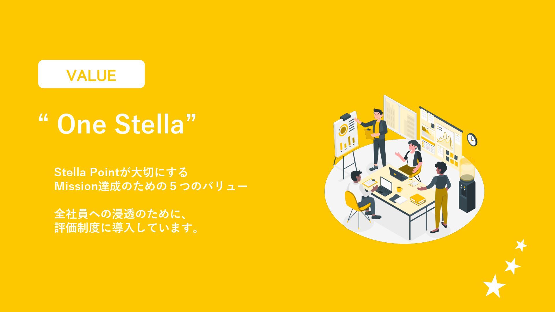 VALUE “ One Stella” Stella Pointが⼤切にする Mission達成のための5つのバリュー 全社員への浸透のために、 評価制度に導⼊しています。