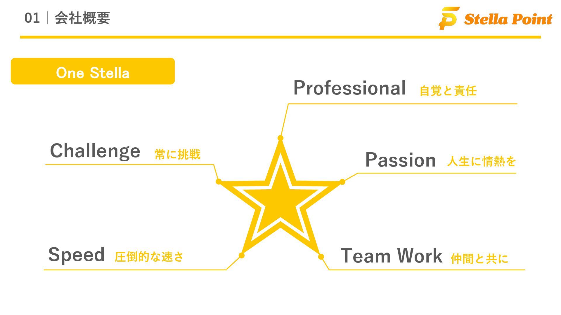 01|会社概要 One Stella Challenge Speed Professional Passion Team Work 圧倒的な速さ