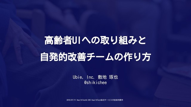 高齢者UIへの取り組みと 自発的改善チームの作り方 Ubie, Inc. 敷地 琢也 @shikichee 2019/07/11 HealthTech0.5#3 HealthTech各社サービスの技術的要件