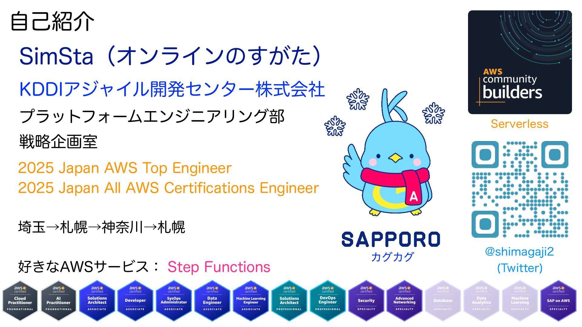 ࣗݾհ +BQBO"845PQ&OHJOFFS +BQBO"MM"84$FSUJGJDBUJPOT&OHJOFFS ࡛ۄˠࡳຈˠਆಸˠࡳຈ ͖ͳ"84αʔϏεɿ4UFQ'VODUJPOT 4JN4UBʢΦϯϥΠϯͷ͕ͨ͢ʣ ,%%*ΞδϟΠϧ։ൃηϯλʔגࣜձࣾ ϓϥοτϑΥʔϜΤϯδχΞϦϯά෦ ઓུاըࣨ 4FSWFSMFTT