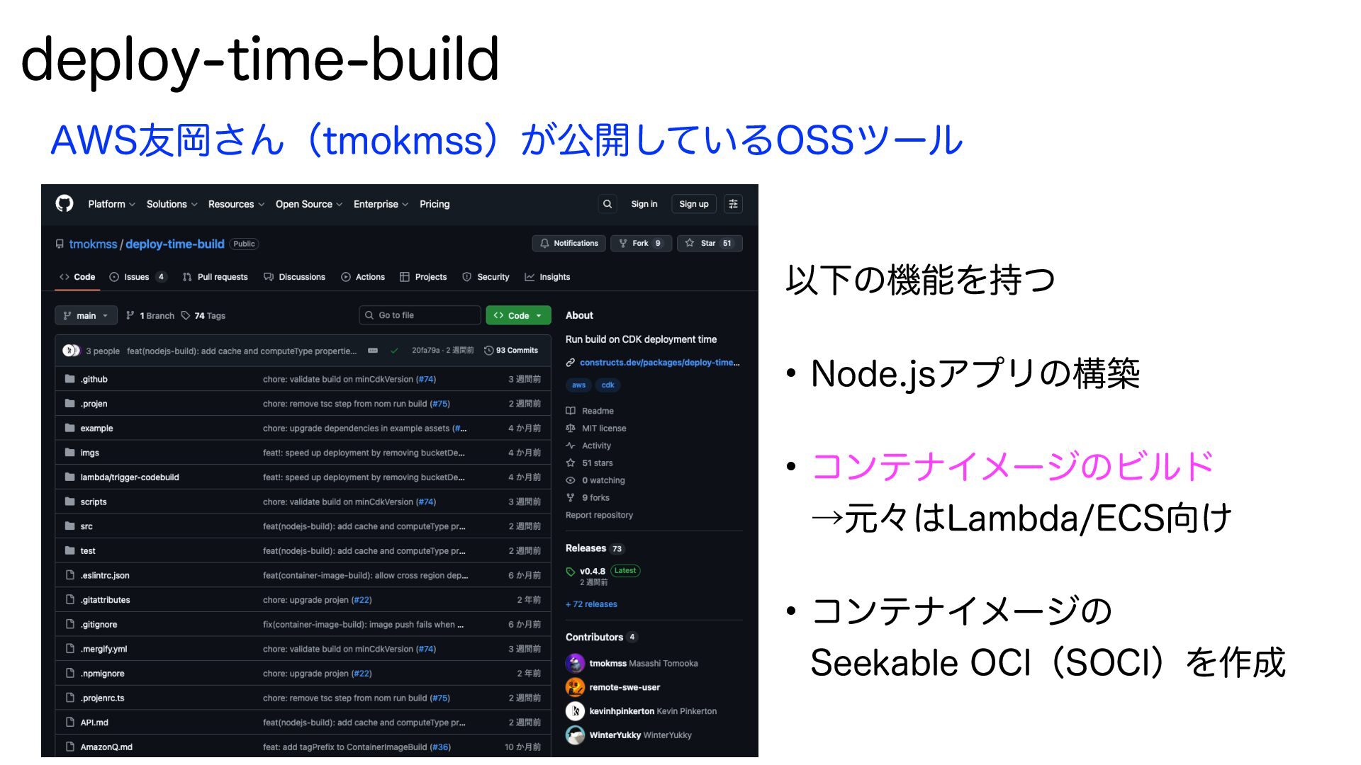 EFQMPZUJNFCVJME "84༑Ԭ͞ΜʢUNPLNTTʣ͕ެ։͍ͯ͠Δ044πʔϧ ҎԼͷػೳΛ࣋ͭ • /PEFKTΞϓϦͷߏங • ίϯςφΠϝʔδͷϏϧυ ˠݩʑ-BNCEB&$4͚ • ίϯςφΠϝʔδͷ
