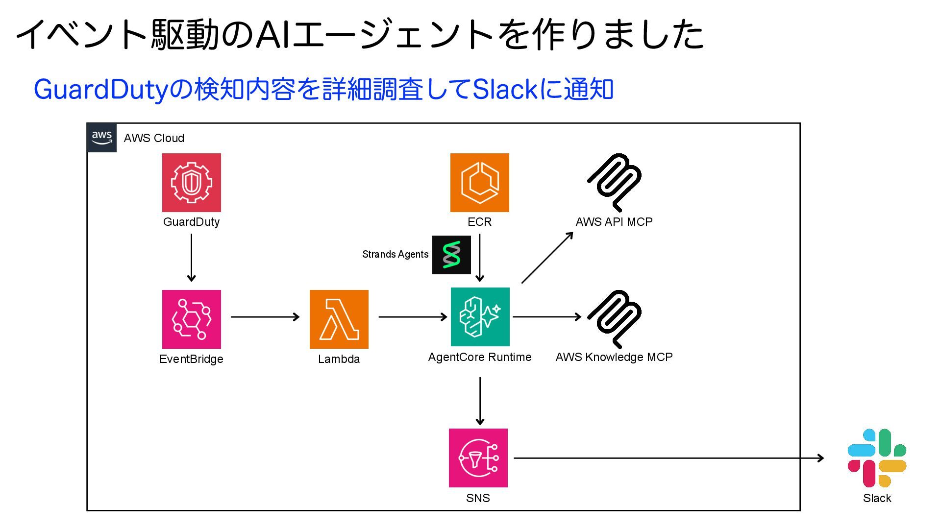 Lambda AWS Knowledge MCP SNS Strands Agents GuardDuty EventBridge (VBSE%VUZͷݕ༰Λৄࡉௐࠪͯ͠4MBDLʹ௨ SNS