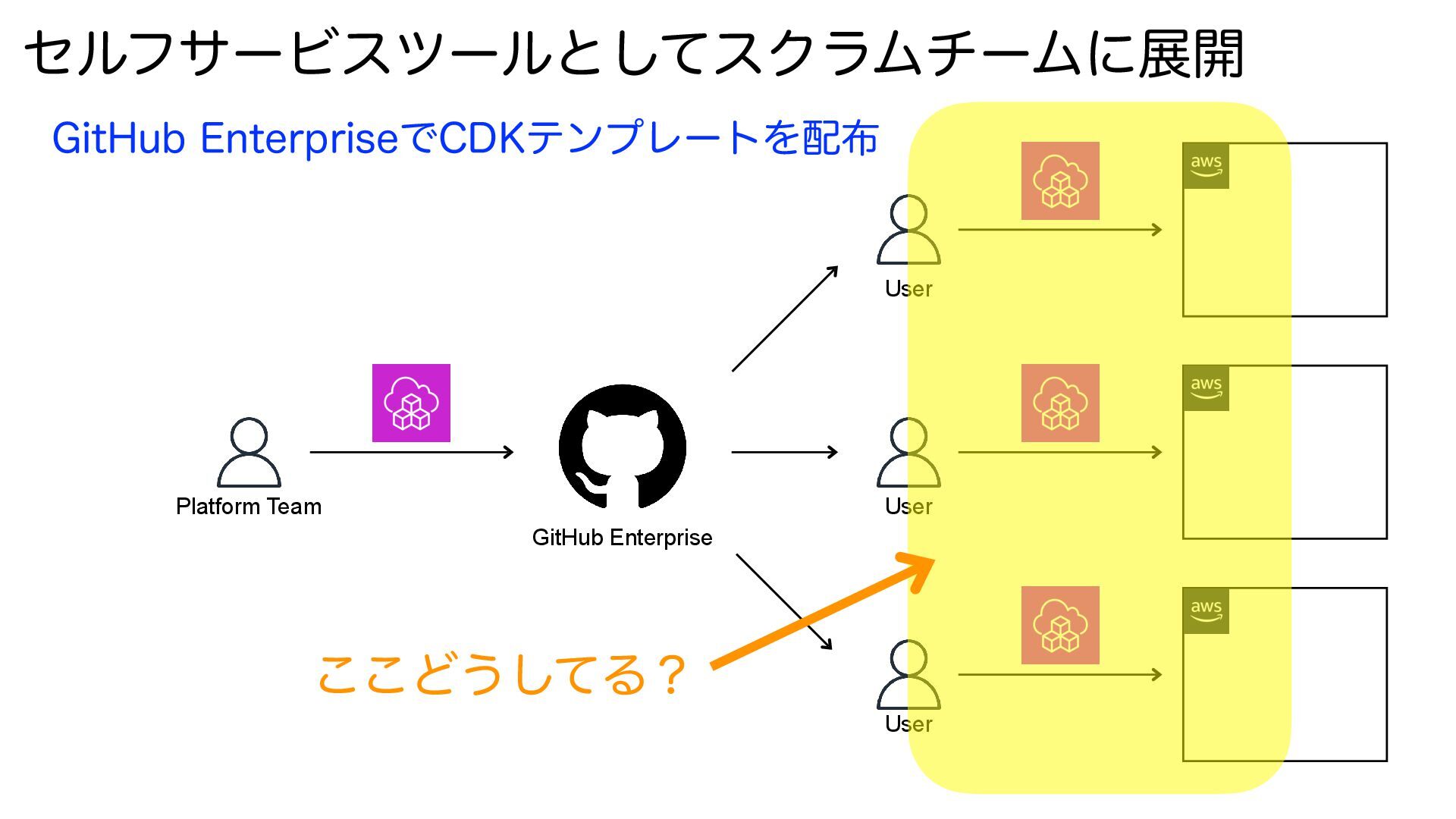 ηϧϑαʔϏεπʔϧͱͯ͠εΫϥϜνʔϜʹల։ Platform Team User User User GitHub Enterprise (JU)VC&OUFSQSJTFͰ$%,ςϯϓϨʔτΛ ͜͜Ͳ͏ͯ͠Δʁ