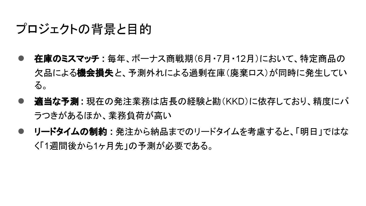 プロジェクトの背景と目的 • 在庫のミスマッチ : 毎年、ボーナス商戦期(6月・7月・12月)において、特定商品の 欠品による機会損失と、予測外れによる過剰在庫(廃棄ロス)が同時に発生してい る。 • 適当な予測 :