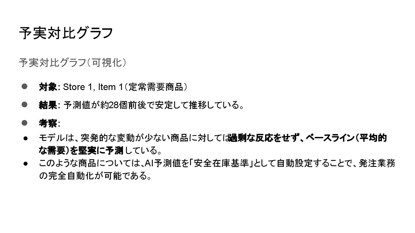 予測値が約28個前後で安定して推移している。 • 考察: • モデルは、突発的な変動が少ない商品に対しては 過剰な反応をせず、ベースライン(平均的 な需要)を堅実に予測 している。 • このような商品については、AI予測値を「安全在庫基準」として自動設定することで、発注業務 の完全自動化が可能である。