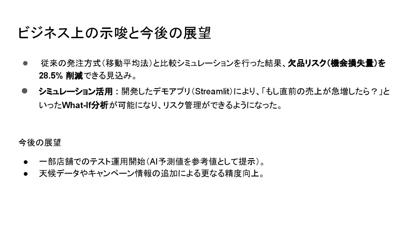 ビジネス上の示唆と今後の展望 • 従来の発注方式(移動平均法)と比較シミュレーションを行った結果、欠品リスク(機会損失量)を 28.5% 削減できる見込み。 • シミュレーション活用 : 開発したデモアプリ(Streamlit)により、「もし直前の売上が急増したら?」と いったWhat-If分析が可能になり、リスク管理ができるようになった。