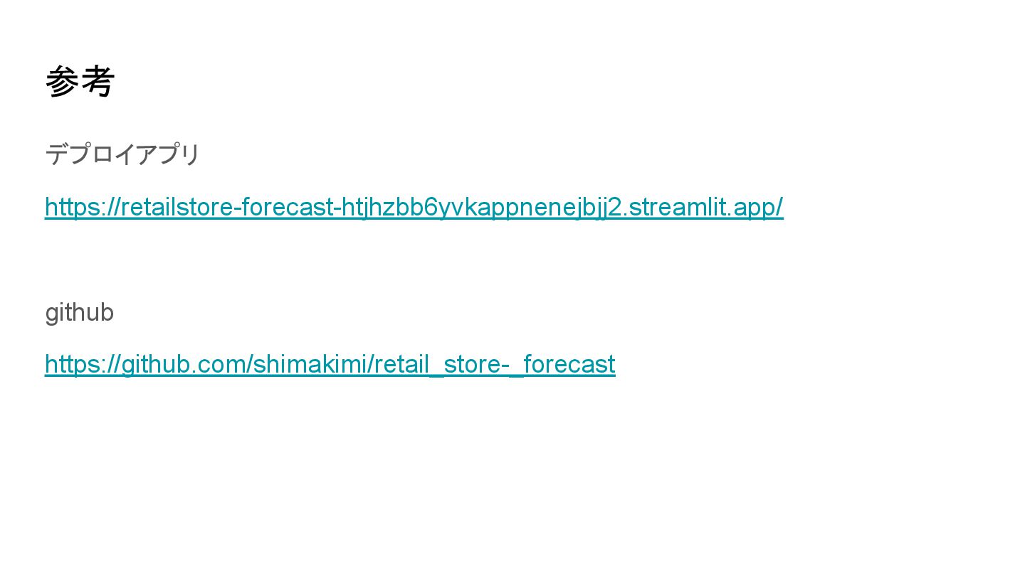 参考 デプロイアプリ https://retailstore-forecast-htjhzbb6yvkappnenejbjj2.streamlit.app/ github https://github.com/shimakimi/retail_store-_forecast