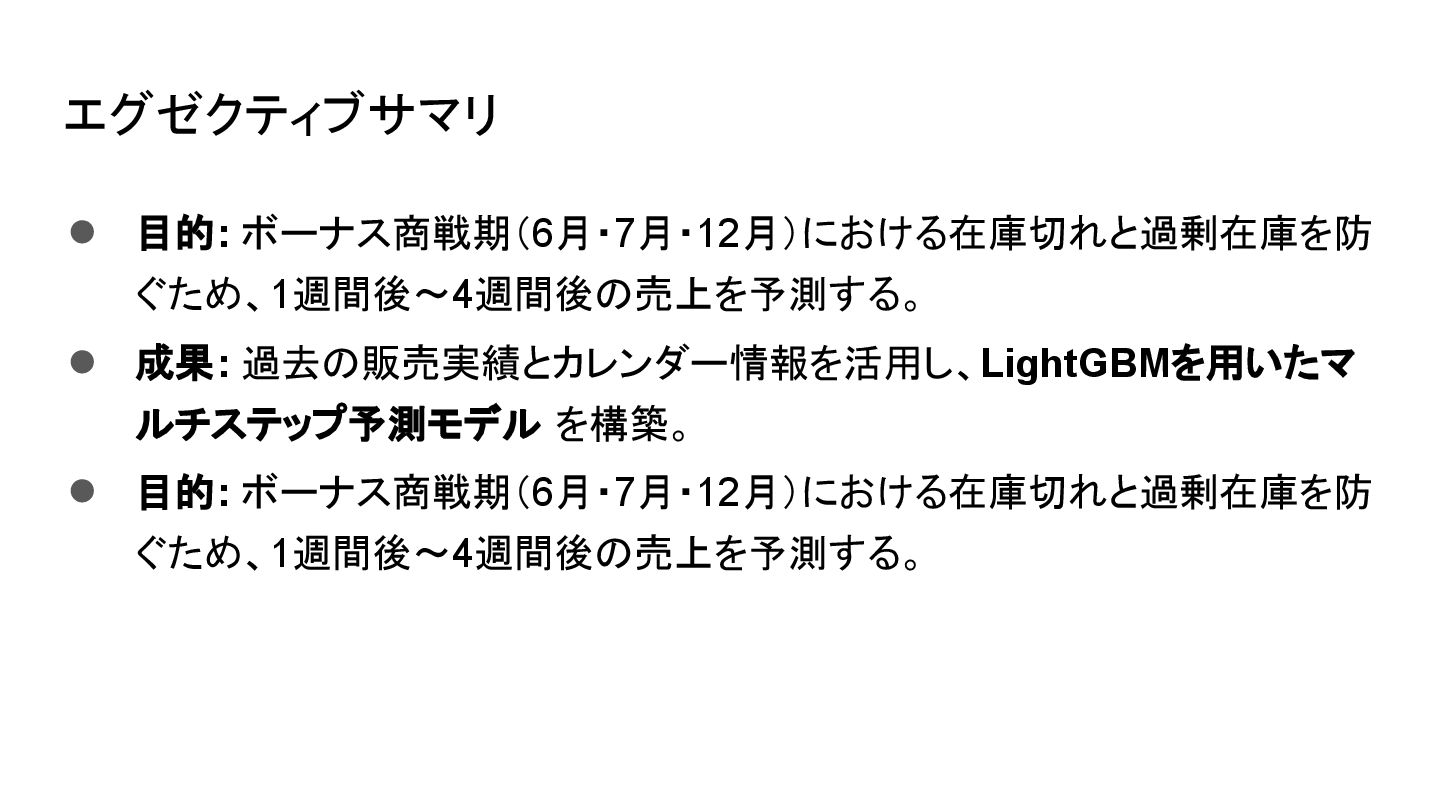 エグゼクティブサマリ • 目的: ボーナス商戦期(6月・7月・12月)における在庫切れと過剰在庫を防 ぐため、1週間後〜4週間後の売上を予測する。 • 成果: 過去の販売実績とカレンダー情報を活用し、LightGBMを用いたマ ルチステップ予測モデル を構築。