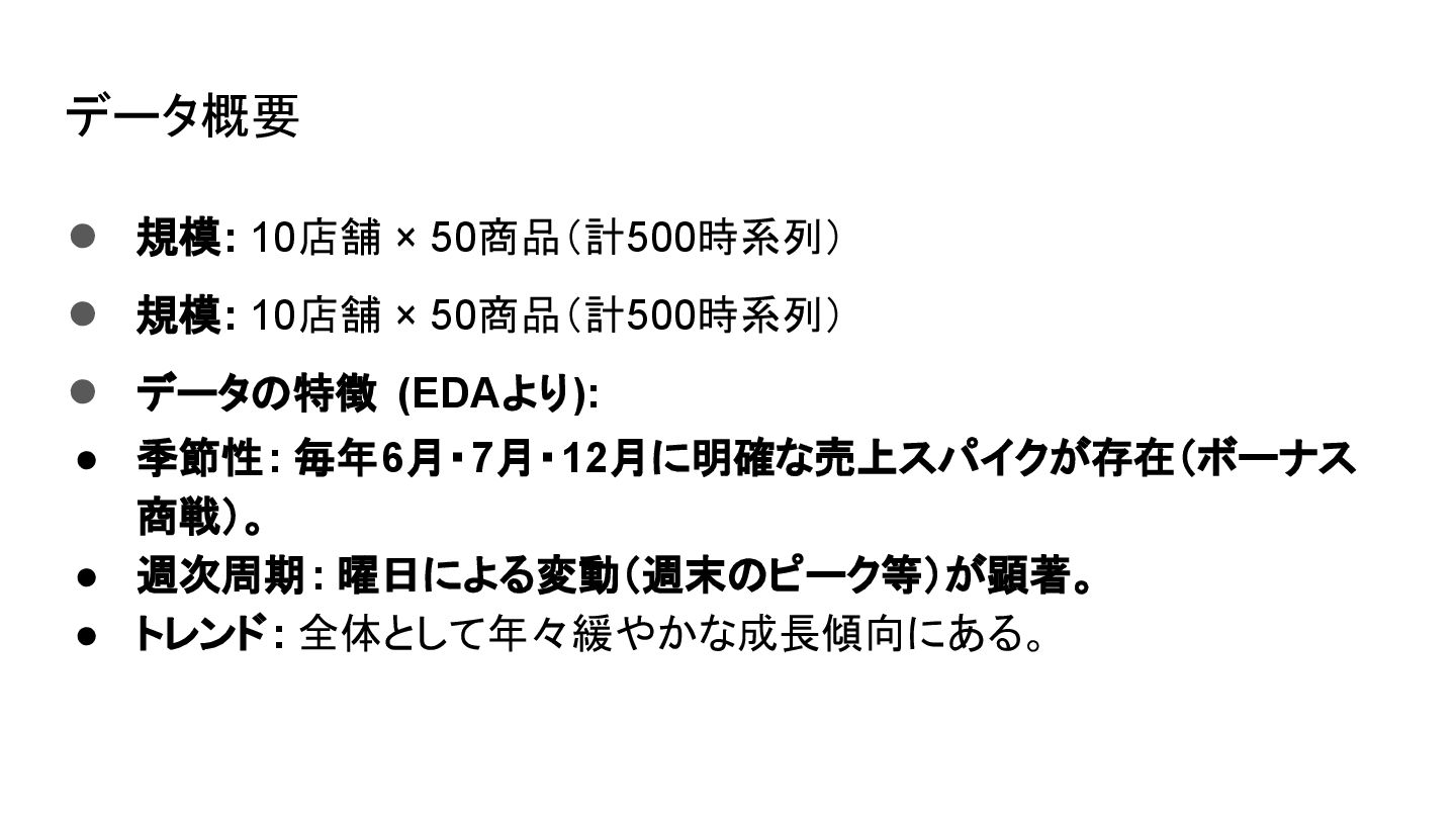 データ概要 • 規模: 10店舗 × 50商品(計500時系列) • 規模: 10店舗 ×