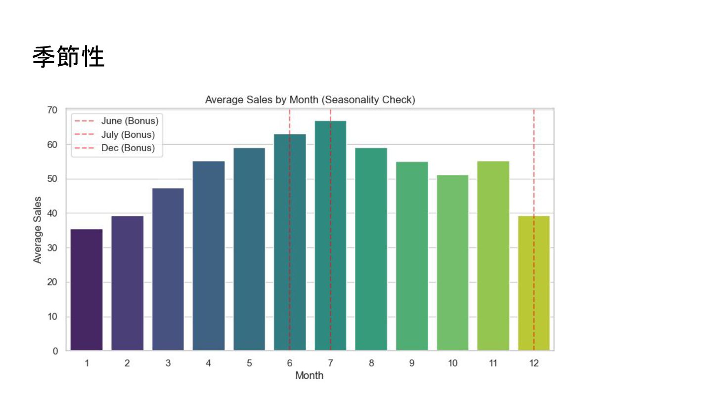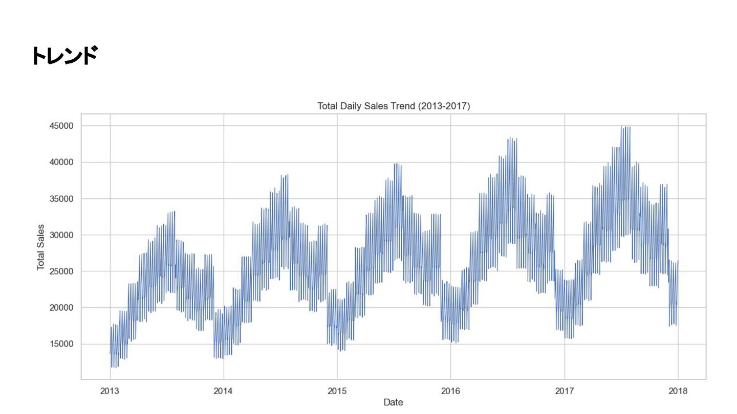 50商品(計500時系列) • データの特徴 (EDAより): • 季節性: 毎年6月・7月・12月に明確な売上スパイクが存在(ボーナス 商戦)。 • 週次周期: 曜日による変動(週末のピーク等)が顕著。 • トレンド: 全体として年々緩やかな成長傾向にある。
