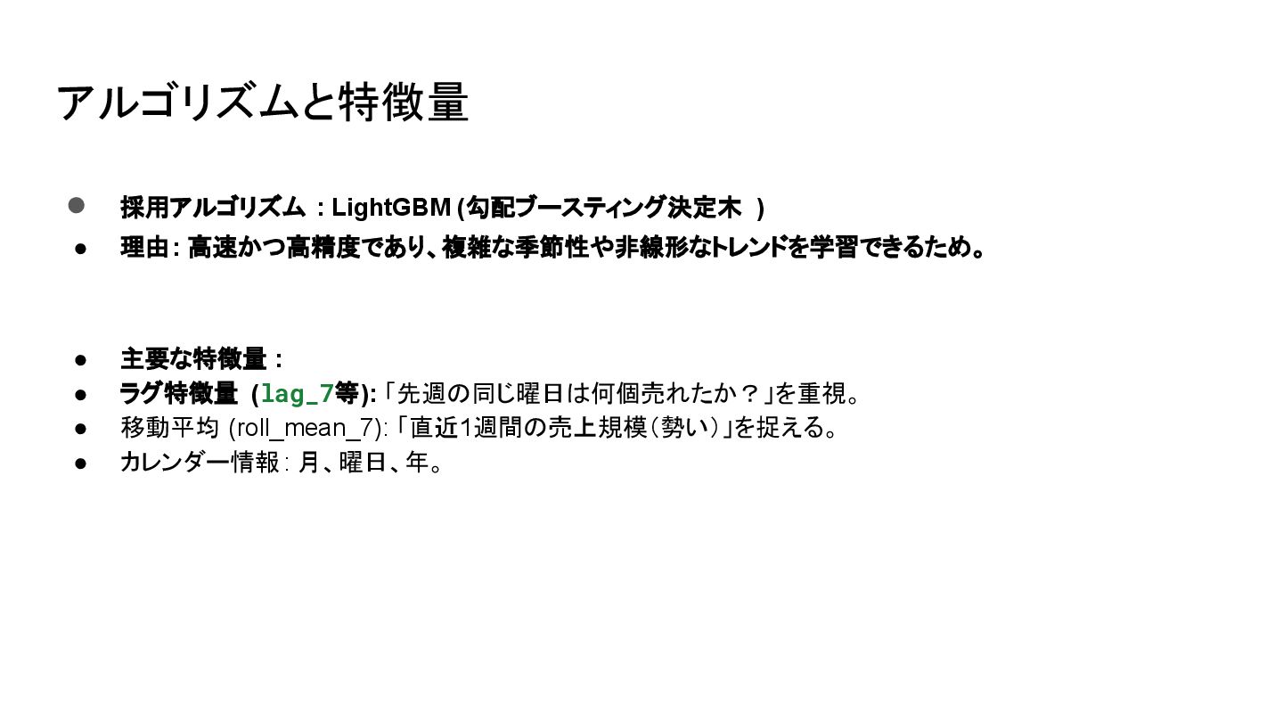 アルゴリズムと特徴量 • 採用アルゴリズム : LightGBM (勾配ブースティング決定木 ) • 理由: 高速かつ高精度であり、複雑な季節性や非線形なトレンドを学習できるため。