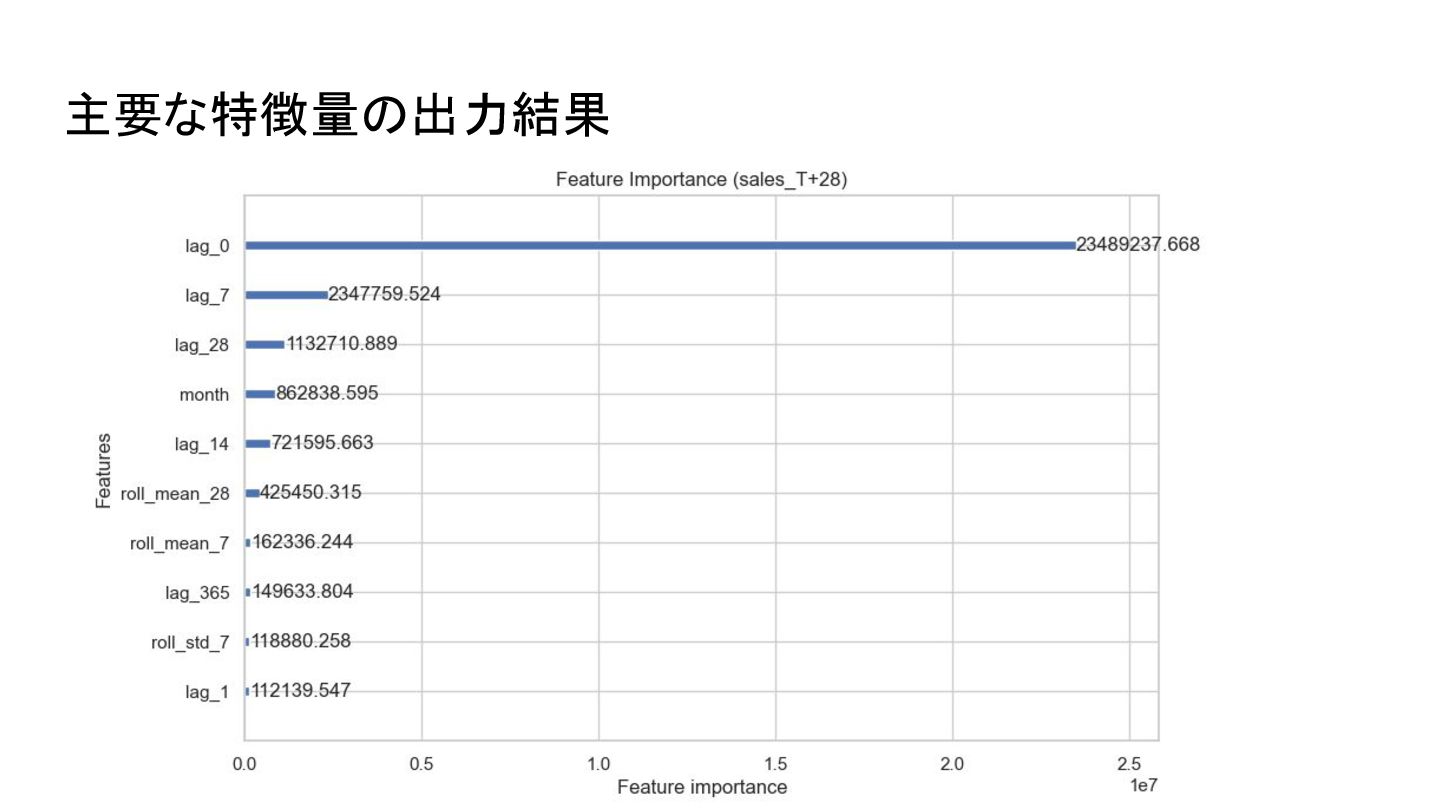 • 主要な特徴量 : • ラグ特徴量 (lag_7等): 「先週の同じ曜日は何個売れたか?」を重視。 • 移動平均 (roll_mean_7): 「直近1週間の売上規模(勢い)」を捉える。 • カレンダー情報: 月、曜日、年。