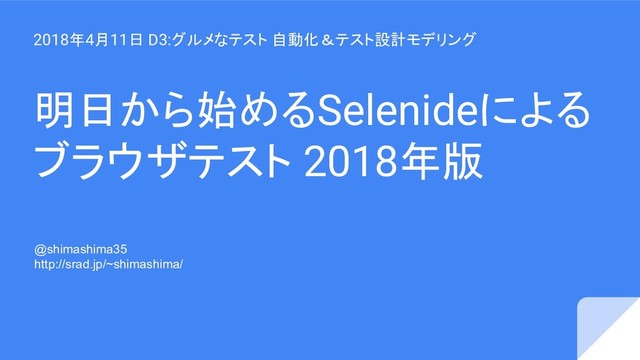明日から始めるSelenideによる ブラウザテスト 2018年版 2018年4月11日 D3:グルメなテスト 自動化&テスト設計モデリング @shimashima35 http://srad.jp/~shimashima/