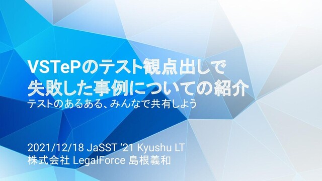 VSTePのテスト観点出しで 失敗した事例についての紹介 テストのあるある、みんなで共有しよう 2021/12/18 JaSST ‘21 Kyushu LT 株式会社 LegalForce