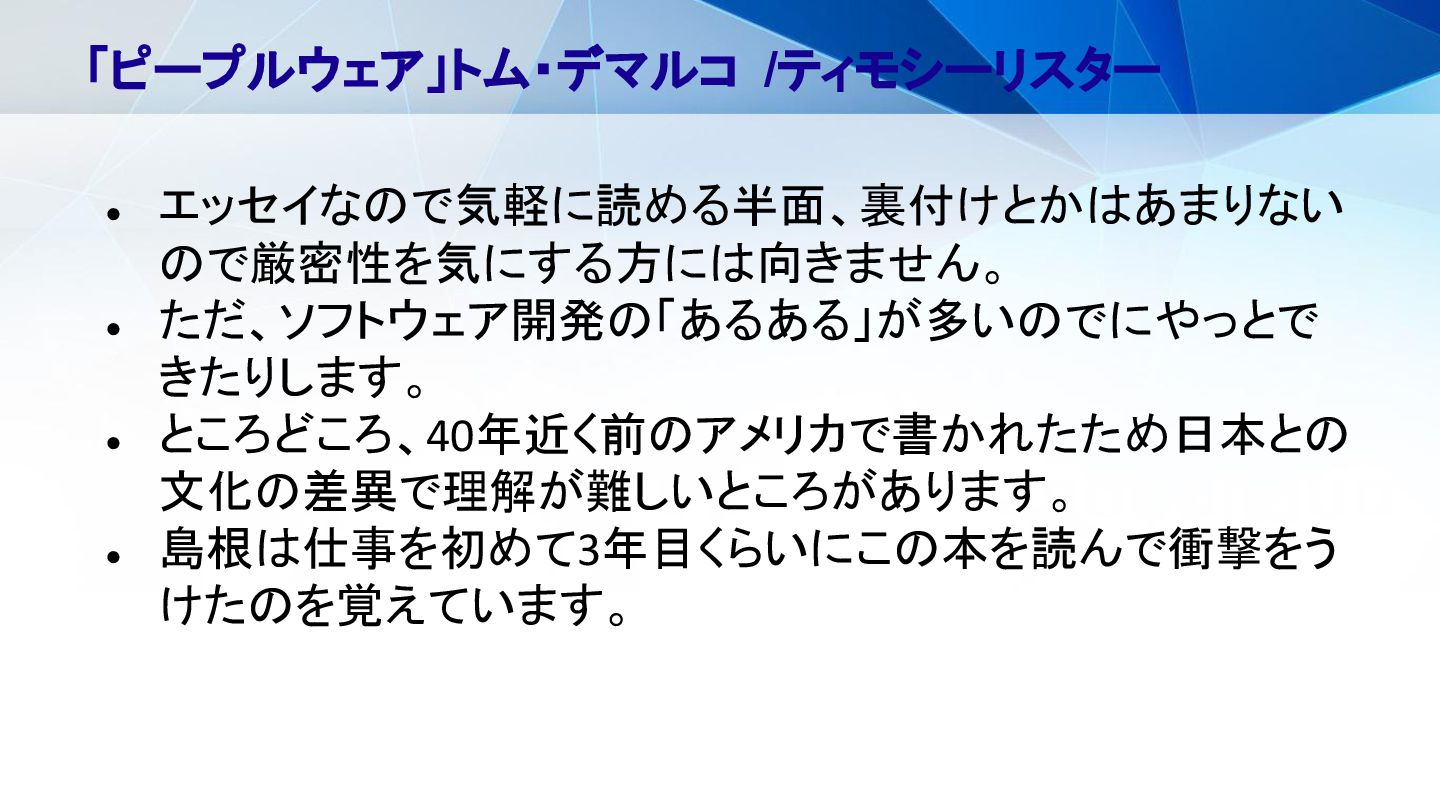 島根は仕事を初めて3年目くらいにこの本を読んで衝撃をう けたのを覚えています。 「ピープルウェア」トム・デマルコ /ティモシーリスター