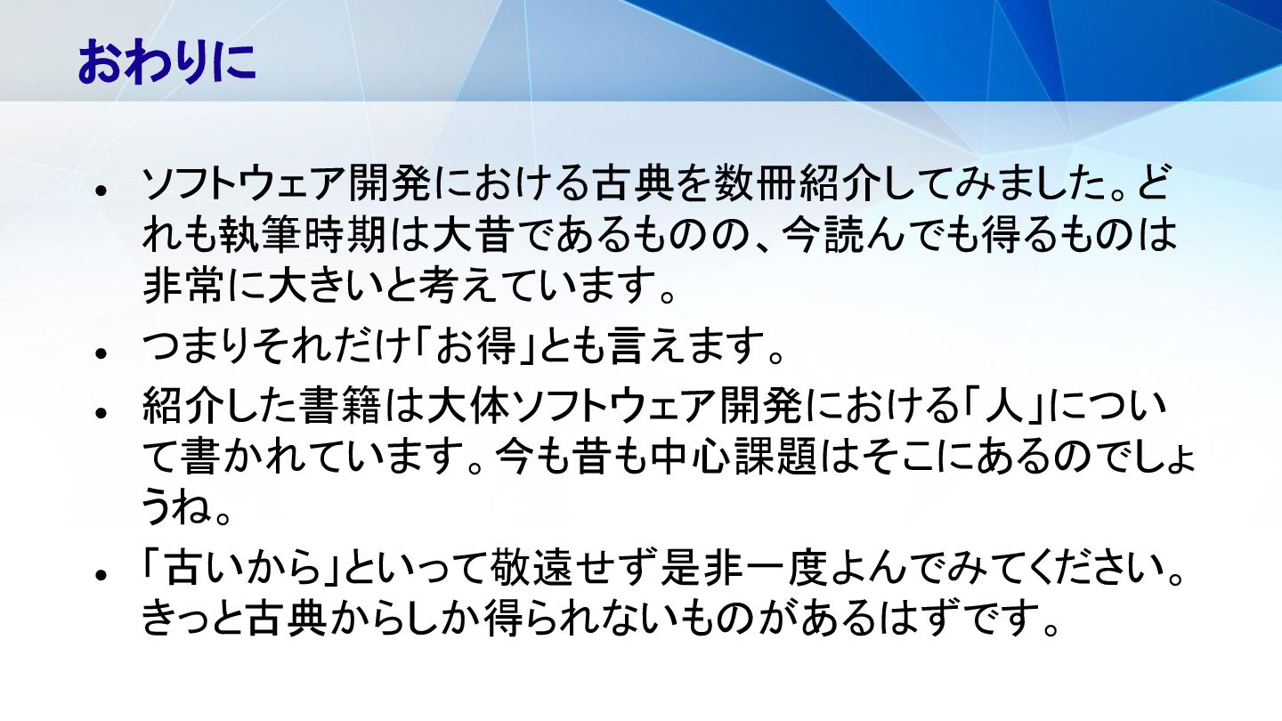 • ソフトウェア開発における古典を数冊紹介してみました。ど れも執筆時期は大昔であるものの、今読んでも得るものは 非常に大きいと考えています。 • つまりそれだけ「お得」とも言えます。 • 紹介した書籍は大体ソフトウェア開発における「人」につい て書かれています。今も昔も中心課題はそこにあるのでしょ うね。