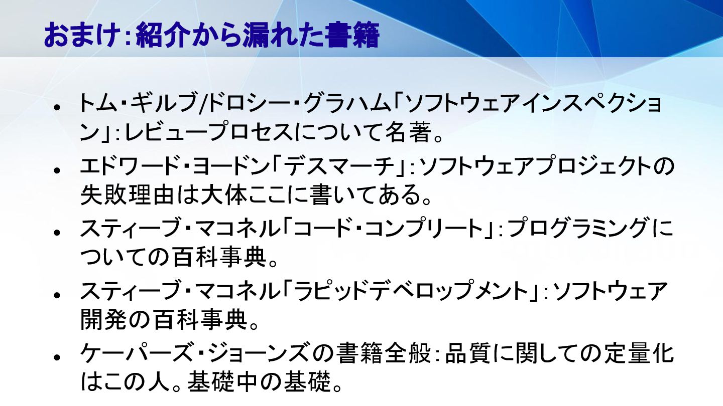 スティーブ・マコネル「ラピッドデベロップメント」:ソフトウェア 開発の百科事典。 • ケーパーズ・ジョーンズの書籍全般:品質に関しての定量化 はこの人。基礎中の基礎。 おまけ:紹介から漏れた書籍