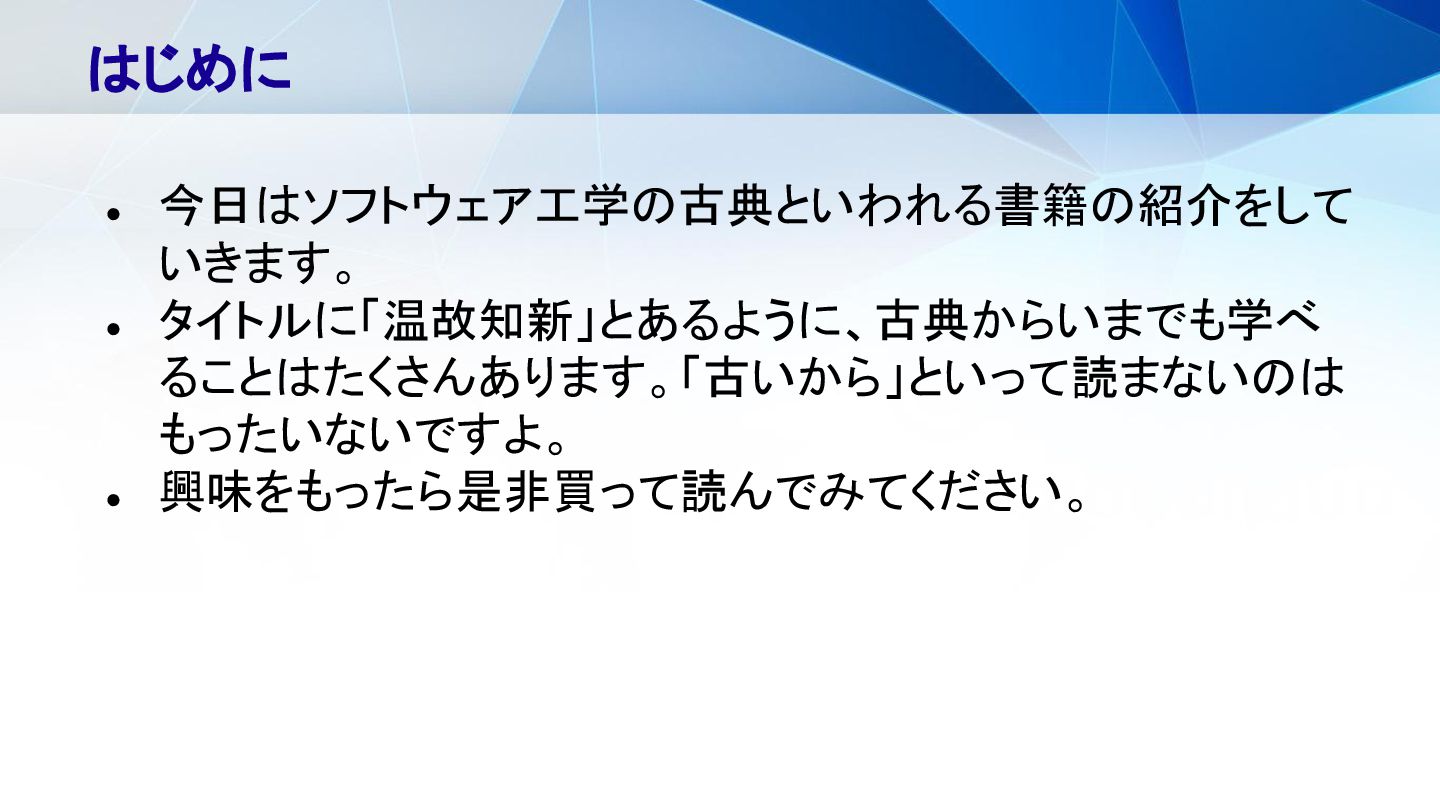 • 今日はソフトウェア工学の古典といわれる書籍の紹介をして いきます。 • タイトルに「温故知新」とあるように、古典からいまでも学べ ることはたくさんあります。「古いから」といって読まないのは もったいないですよ。 • 興味をもったら是非買って読んでみてください。 はじめに