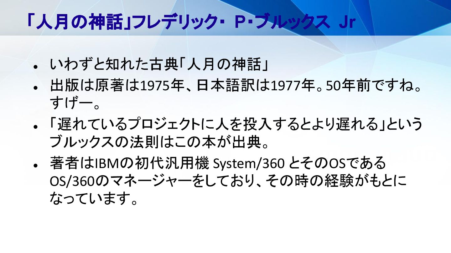 • いわずと知れた古典「人月の神話」 • 出版は原著は1975年、日本語訳は1977年。50年前ですね。 すげー。 • 「遅れているプロジェクトに人を投入するとより遅れる」という ブルックスの法則はこの本が出典。 • 著者はIBMの初代汎用機