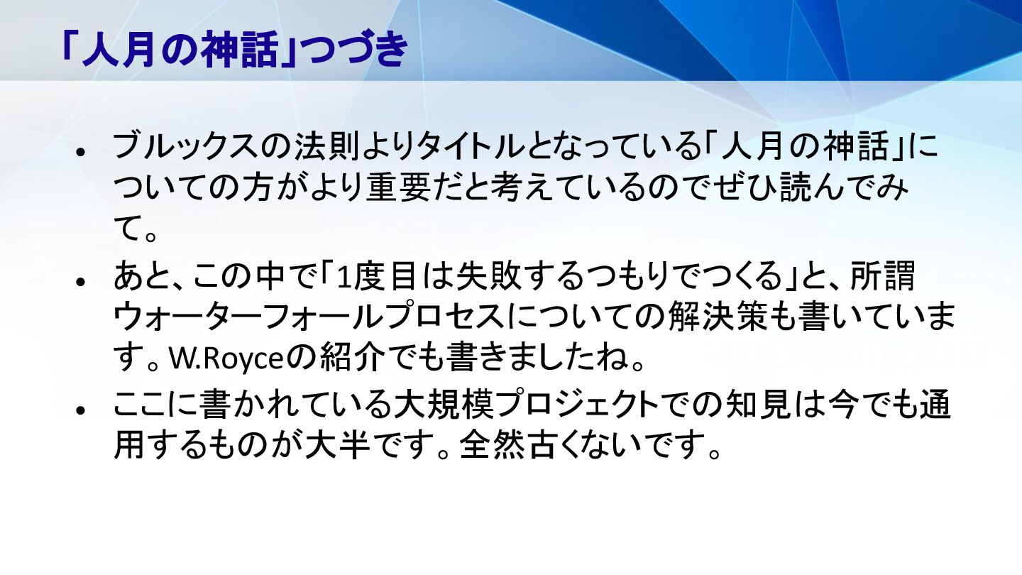 • エッセイなので気軽に読める半面、裏付けとかはあまりない ので厳密性を気にする方には向きません。 • ただ、ソフトウェア開発の「あるある」が多いのでにやっとで きたりします。 • ところどころ、40年近く前のアメリカで書かれたため日本との 文化の差異で理解が難しいところがあります。 •