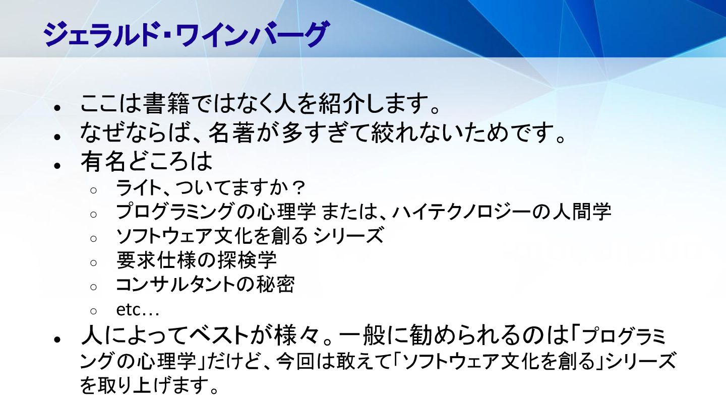 または、ハイテクノロジーの人間学 ◦ ソフトウェア文化を創る シリーズ ◦ 要求仕様の探検学 ◦ コンサルタントの秘密 ◦ etc… • 人によってベストが様々。一般に勧められるのは「プログラミ ングの心理学」だけど、今回は敢えて「ソフトウェア文化を創る」シリーズ を取り上げます。 ジェラルド・ワインバーグ