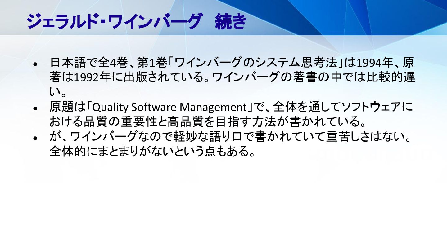 • 日本語で全4巻、第1巻「ワインバーグのシステム思考法」は1994年、原 著は1992年に出版されている。ワインバーグの著書の中では比較的遅 い。 • 原題は「Quality Software Management」で、全体を通してソフトウェアに おける品質の重要性と高品質を目指す方法が書かれている。 •