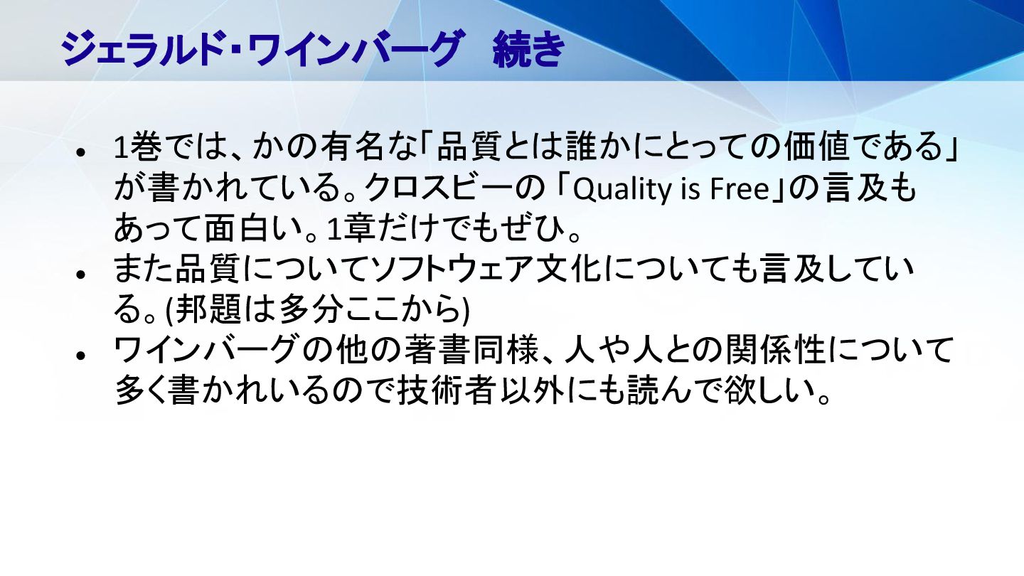 が、ワインバーグなので軽妙な語り口で書かれていて重苦しさはない。 全体的にまとまりがないという点もある。 ジェラルド・ワインバーグ 続き