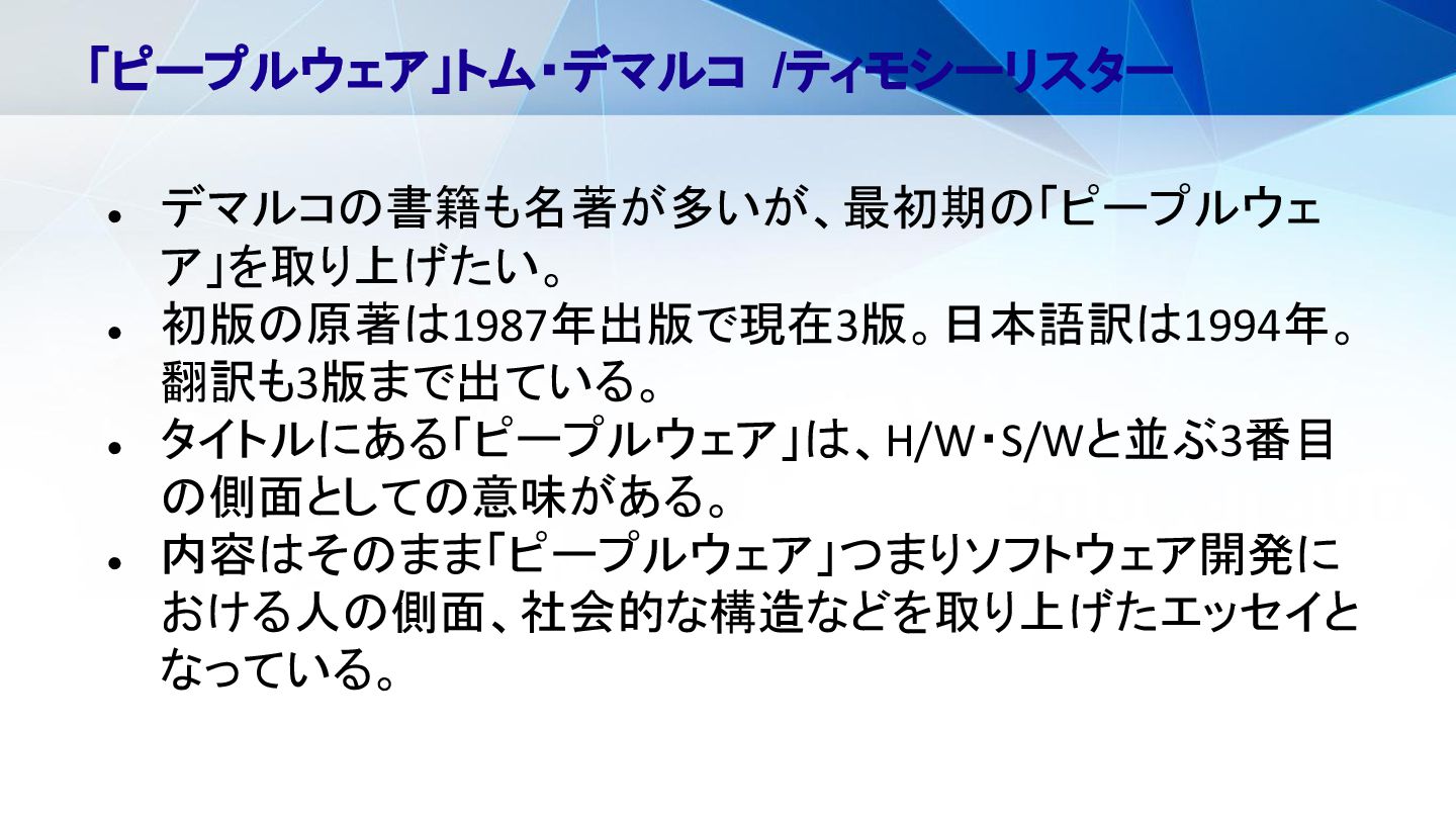 内容はそのまま「ピープルウェア」つまりソフトウェア開発に おける人の側面、社会的な構造などを取り上げたエッセイと なっている。 「ピープルウェア」トム・デマルコ /ティモシーリスター