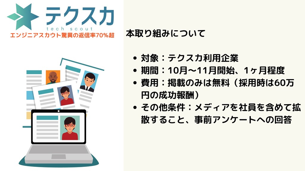 対象:テクスカ利用企業 期間:10月〜11月開始、1ヶ月程度 費用:掲載のみは無料(採用時は60万 円の成功報酬) その他条件:メディアを社員を含めて拡 散すること、事前アンケートへの回答 本取り組みについて エンジニアスカウト驚異の返信率70%超