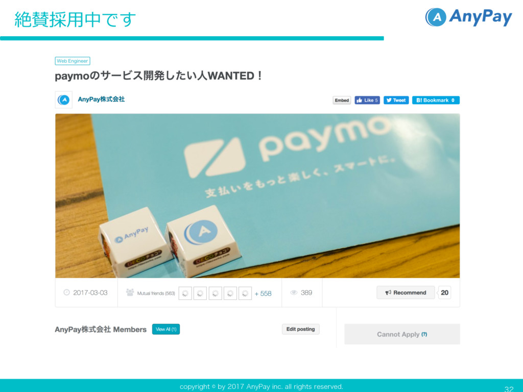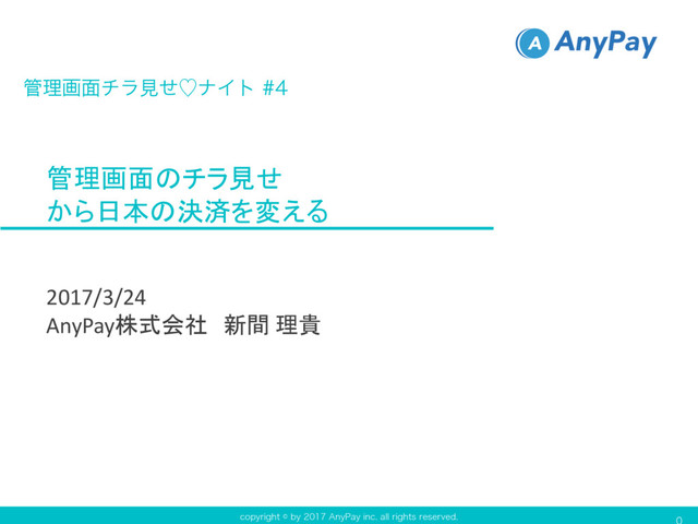 DPQZSJHIUCZ"OZ1BZJOD BMMSJHIUTSFTFSWFE 管理画面のチラ見せ から日本の決済を変える 2017/3/24 AnyPay株式会社 新間 理貴 ཧը໘νϥݟͤὑφΠτ