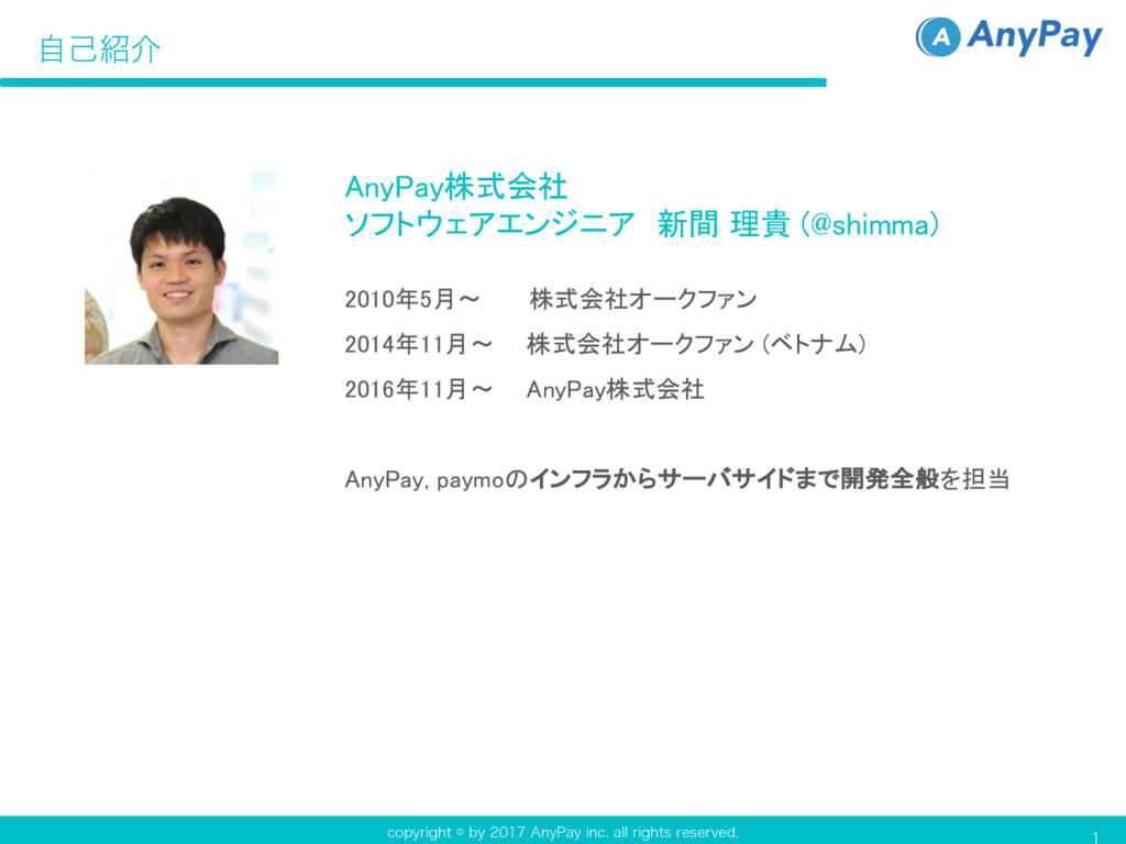DPQZSJHIUCZ"OZ1BZJOD BMMSJHIUTSFTFSWFE AnyPay株式会社 ソフトウェアエンジニア 新間 理貴 (@shimma) 2010年5月〜 株式会社オークファン 2014年11月〜