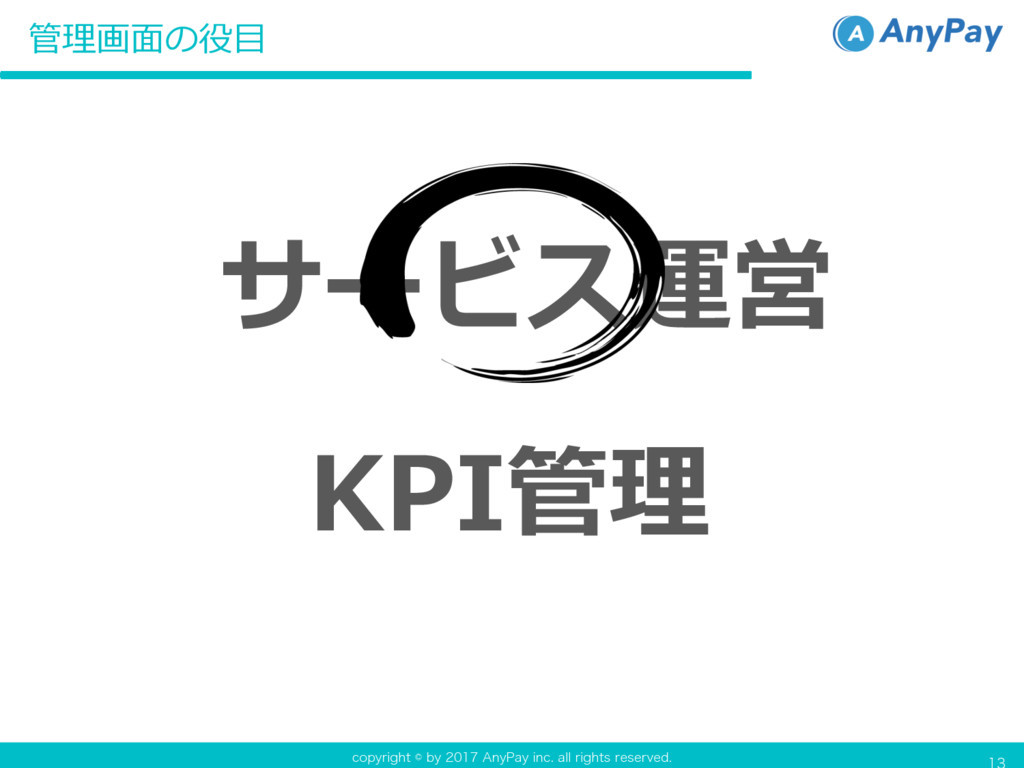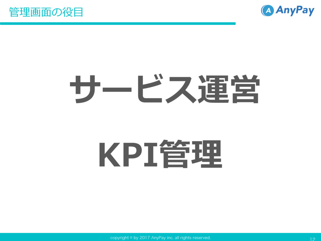 DPQZSJHIUCZ"OZ1BZJOD BMMSJHIUTSFTFSWFE 管理画⾯の役⽬ KPI管理 サービス運営