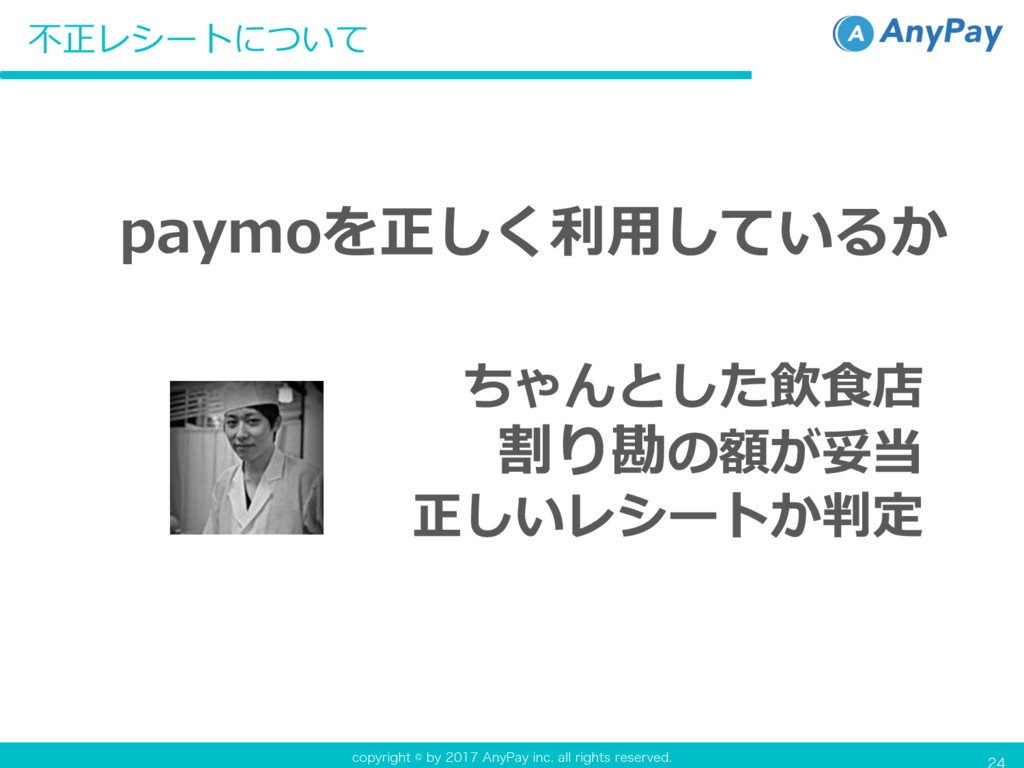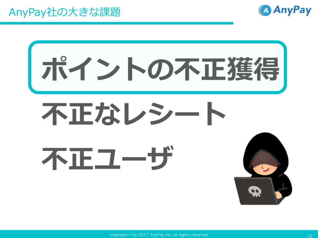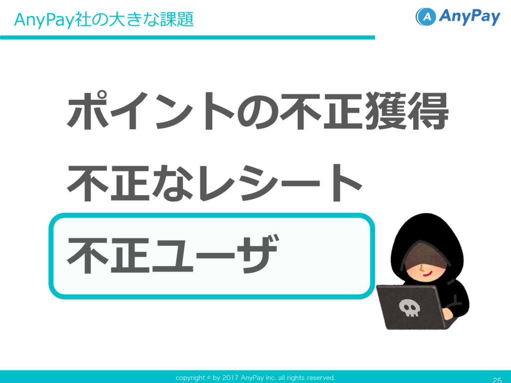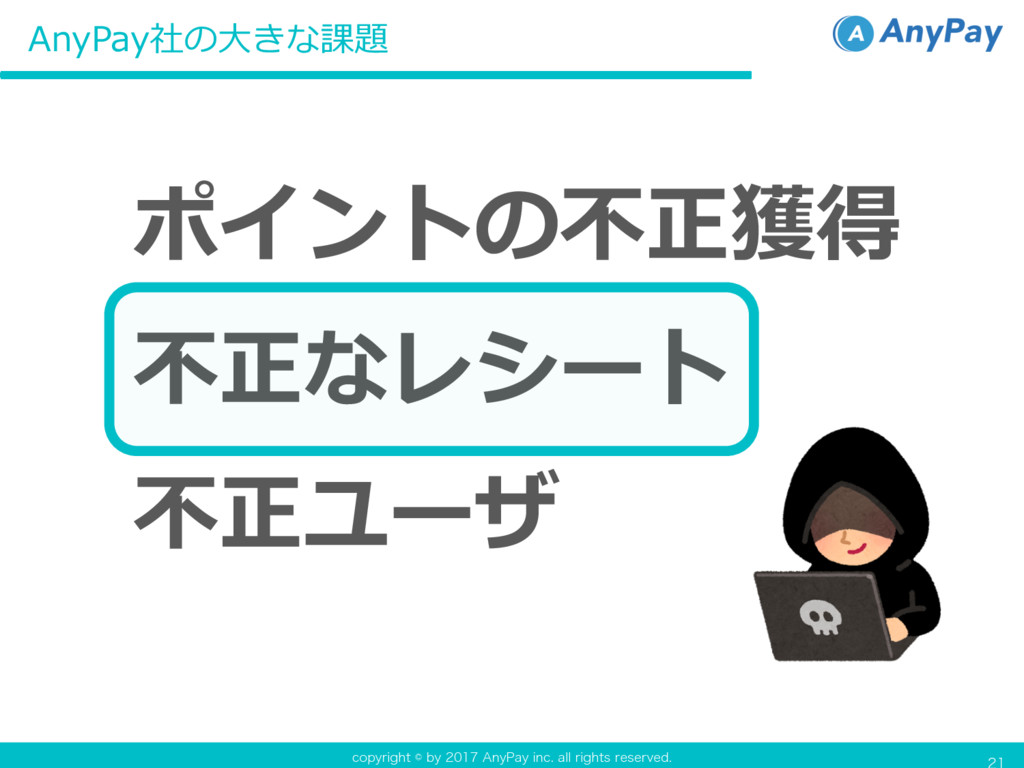 DPQZSJHIUCZ"OZ1BZJOD BMMSJHIUTSFTFSWFE AnyPay社の⼤きな課題 不正ユーザ 不正なレシート ポイントの不正獲得