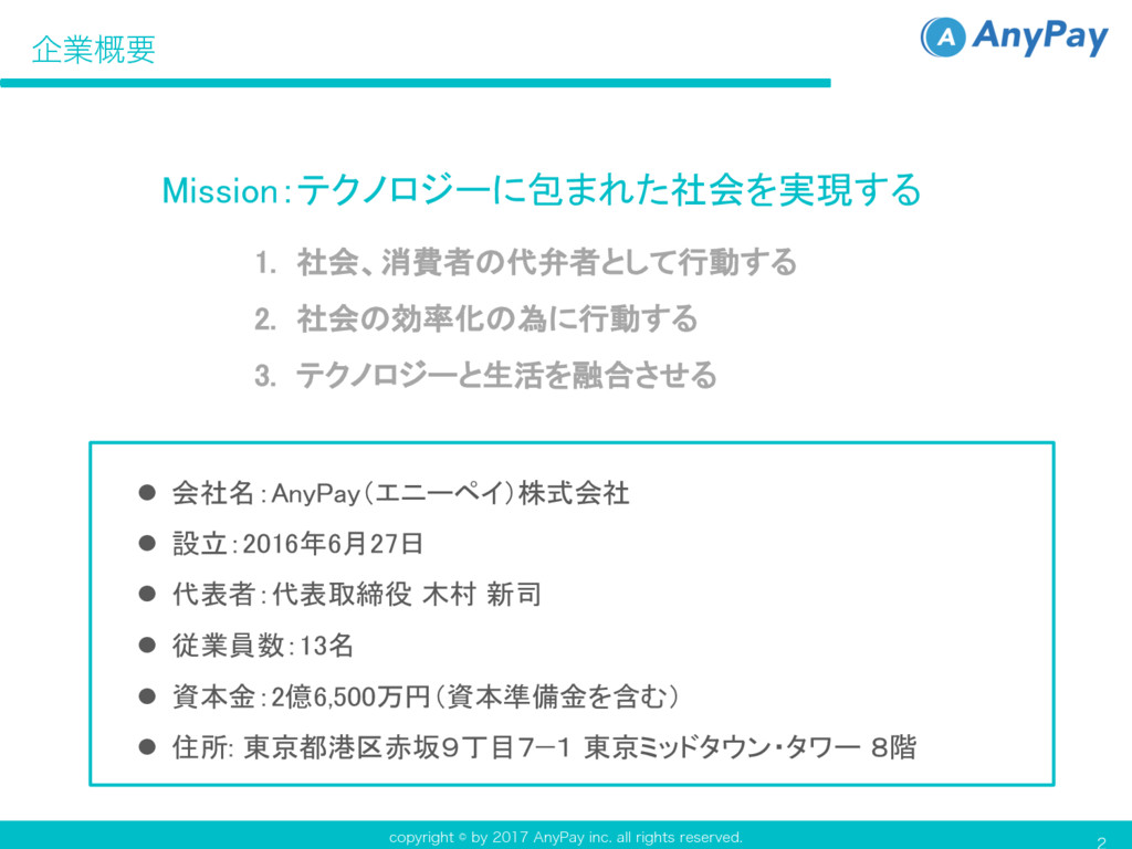 DPQZSJHIUCZ"OZ1BZJOD BMMSJHIUTSFTFSWFE l 会社名:AnyPay(エニーペイ)株式会社 l 設立:2016年6月27日 l 代表者:代表取締役 木村 新司