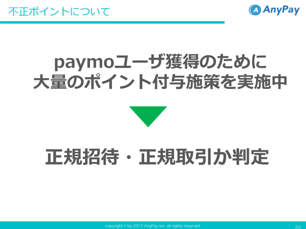 DPQZSJHIUCZ"OZ1BZJOD BMMSJHIUTSFTFSWFE 正規招待・正規取引か判定 不正ポイントについて paymoユーザ獲得のために ⼤量のポイント付与施策を実施中