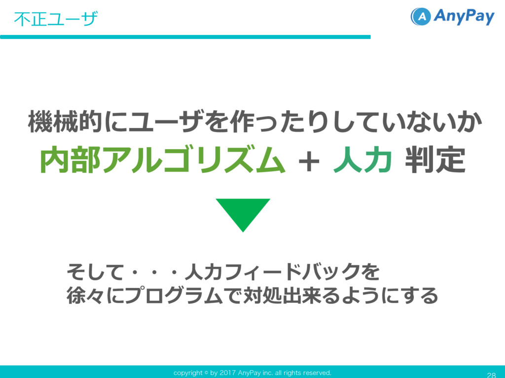 DPQZSJHIUCZ"OZ1BZJOD BMMSJHIUTSFTFSWFE 機械的にユーザを作ったりしていないか 不正ユーザ 内部アルゴリズム + ⼈⼒ 判定 そして・・・⼈⼒フィードバックを 徐々にプログラムで対処出来るようにする