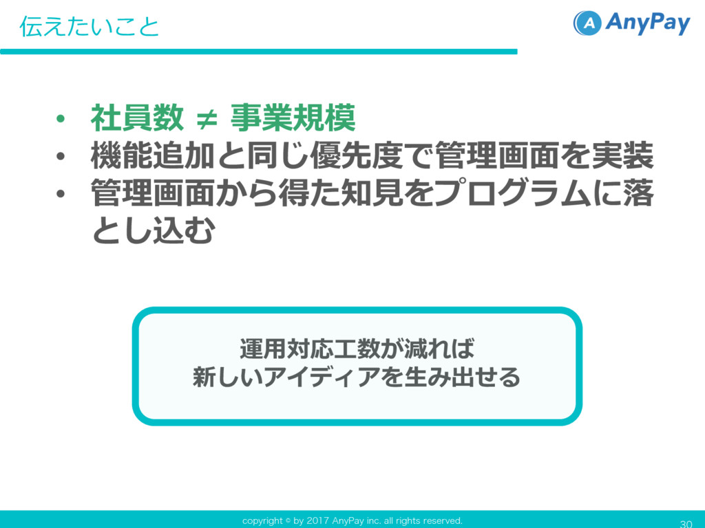 DPQZSJHIUCZ"OZ1BZJOD BMMSJHIUTSFTFSWFE • 社員数 ≠ 事業規模 • 機能追加と同じ優先度で管理画⾯を実装 • 管理画⾯から得た知⾒をプログラムに落