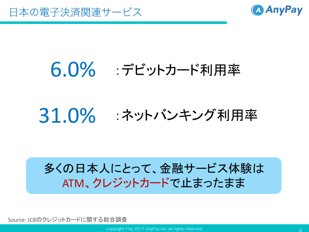 DPQZSJHIUCZ"OZ1BZJOD BMMSJHIUTSFTFSWFE ຊͷిࢠܾࡁؔ࿈αʔϏε 6.0% :デビットカード利用率 31.0% :ネットバンキング利用率 Source: JCBのクレジットカードに関する総合調査 多くの日本人にとって、金融サービス体験は